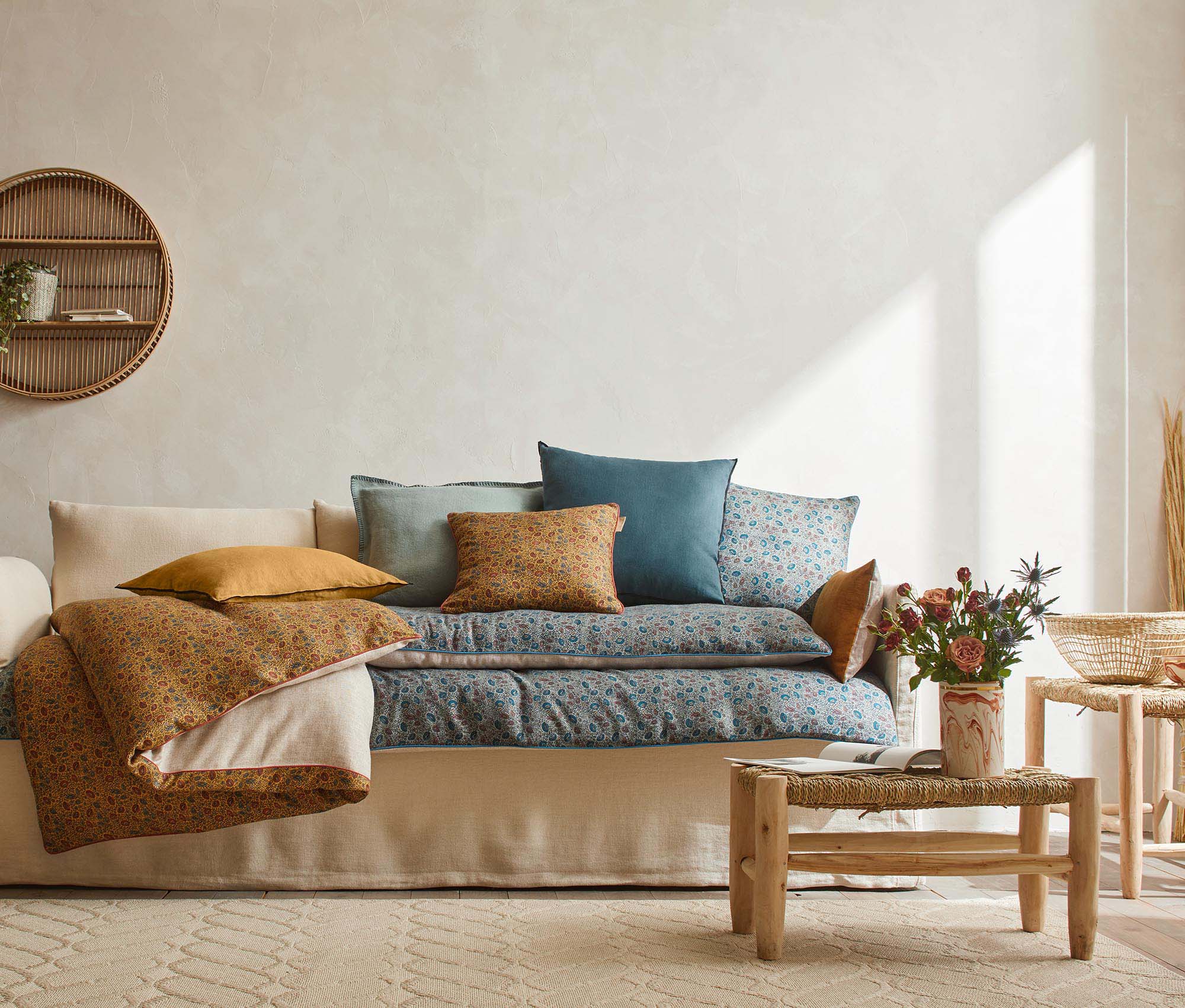 Ob als Vorhang, Kissen oder Bettwäsche, wir haben uns ein sommerliches Universum mit warmen Farben ausgedacht, für Sie können es überall im Haus wiederfinden.