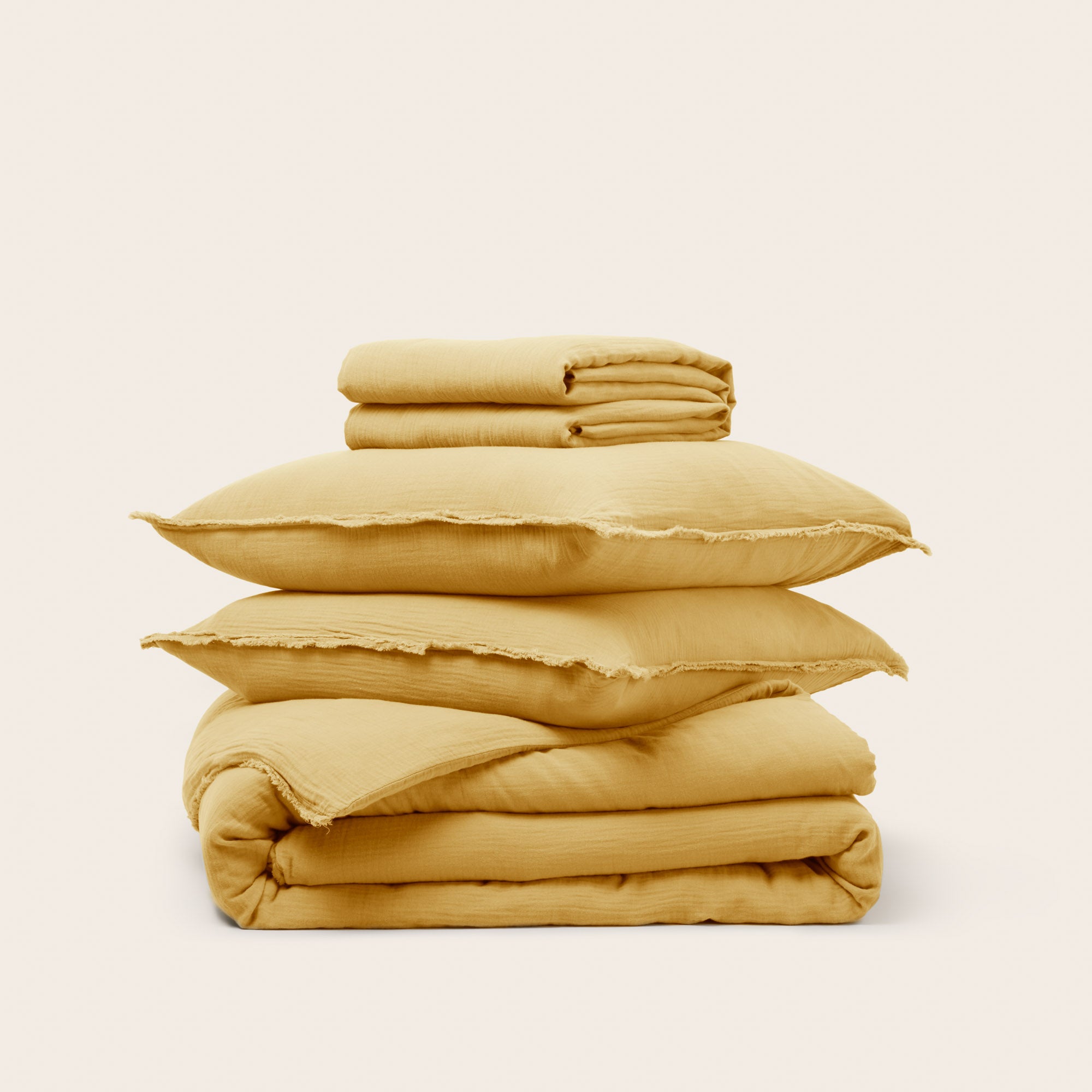 Die strohgelbe Bettwäsche Lou aus gewaschener Baumwollgaze ist sehr angenehm auf der Haut und sorgt für einen erholsamen Schlaf.