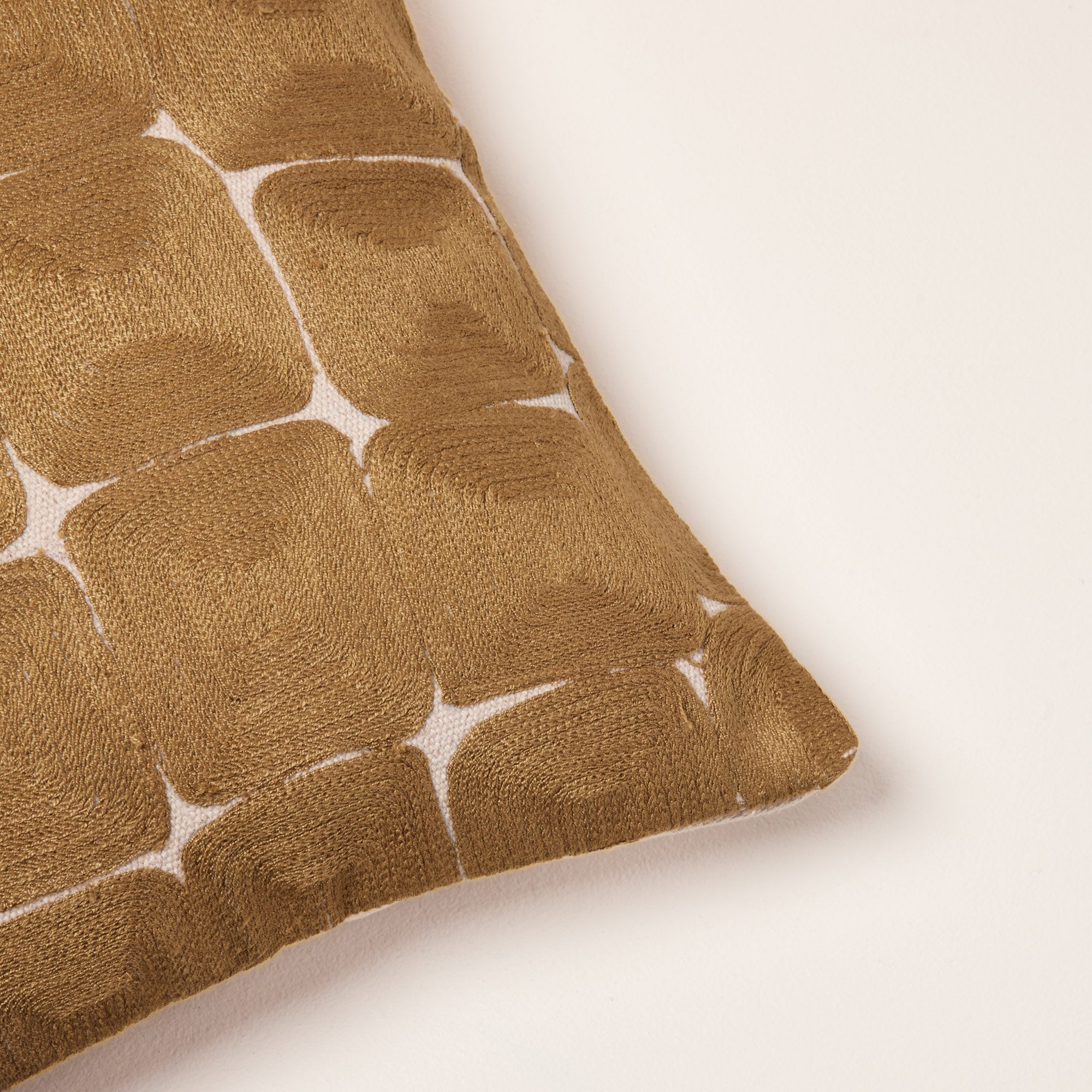 Die Kettenstichtechnik erzeugt auf einem rohen Baumwollstoff ein Relief, und das leicht satinierte Garn schimmert in subtilen Farbtönen. Die Patina der Terrakotta- und Goldgelb-Farben der Karty-Kissenbezüge verleiht Ihrem Zuhause Wärme und viele Nuancen.