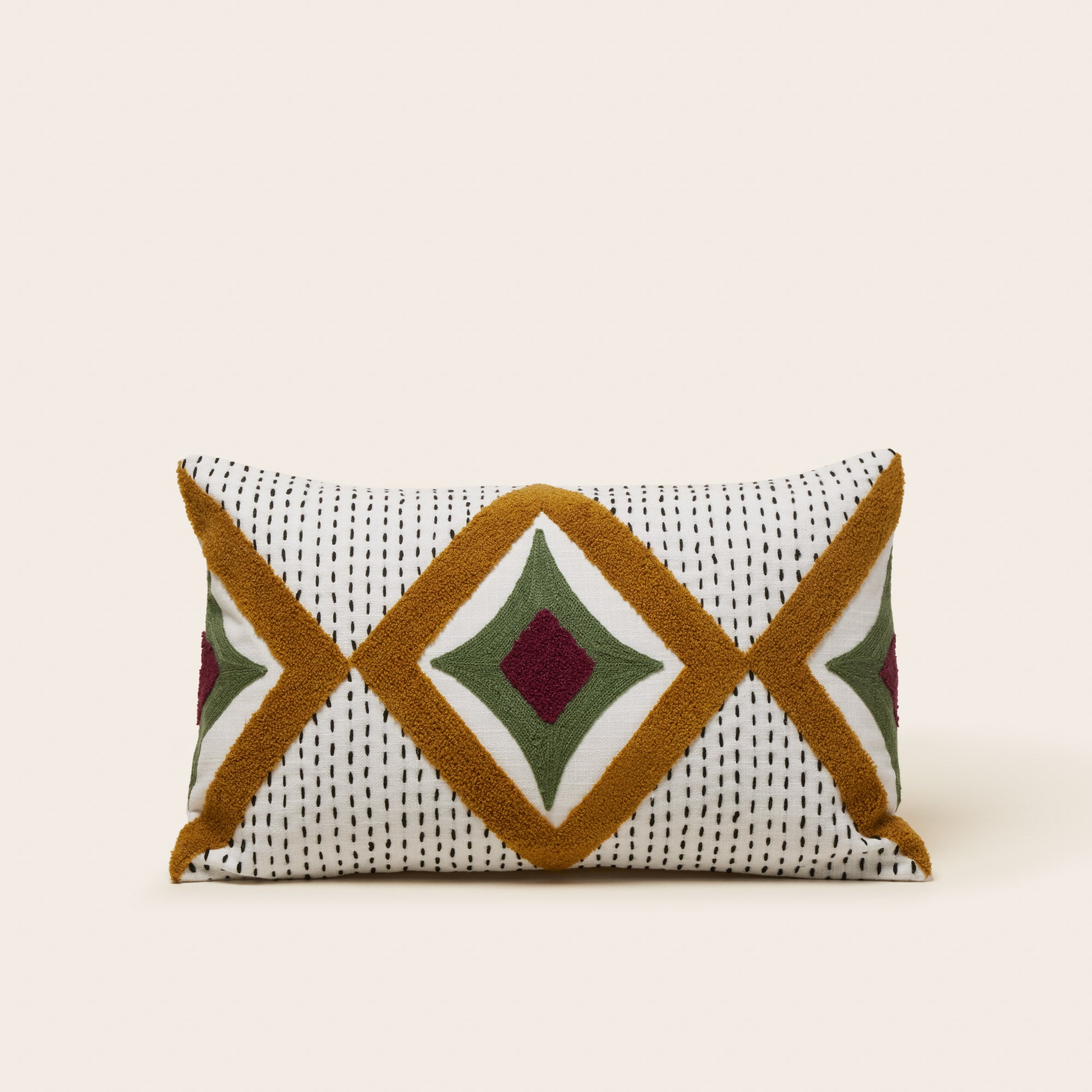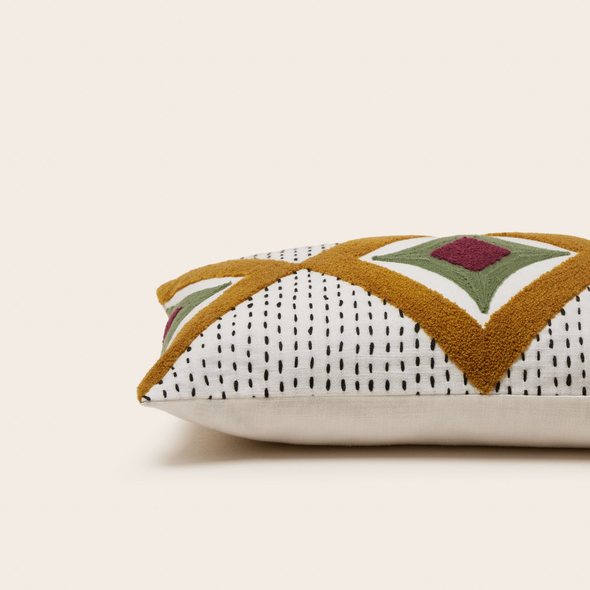 Die verschiedenen Techniken, die für die Herstellung der Zayi-Kissen verwendet werden, sind so reichhaltig wie die Farben, aus denen sie bestehen. Das gepunktete Muster ist im Vorwärtsstich gearbeitet und hebt die Rauten hervor, die ihrerseits mit Bouclé- und Kettenstich gefertigt werden.