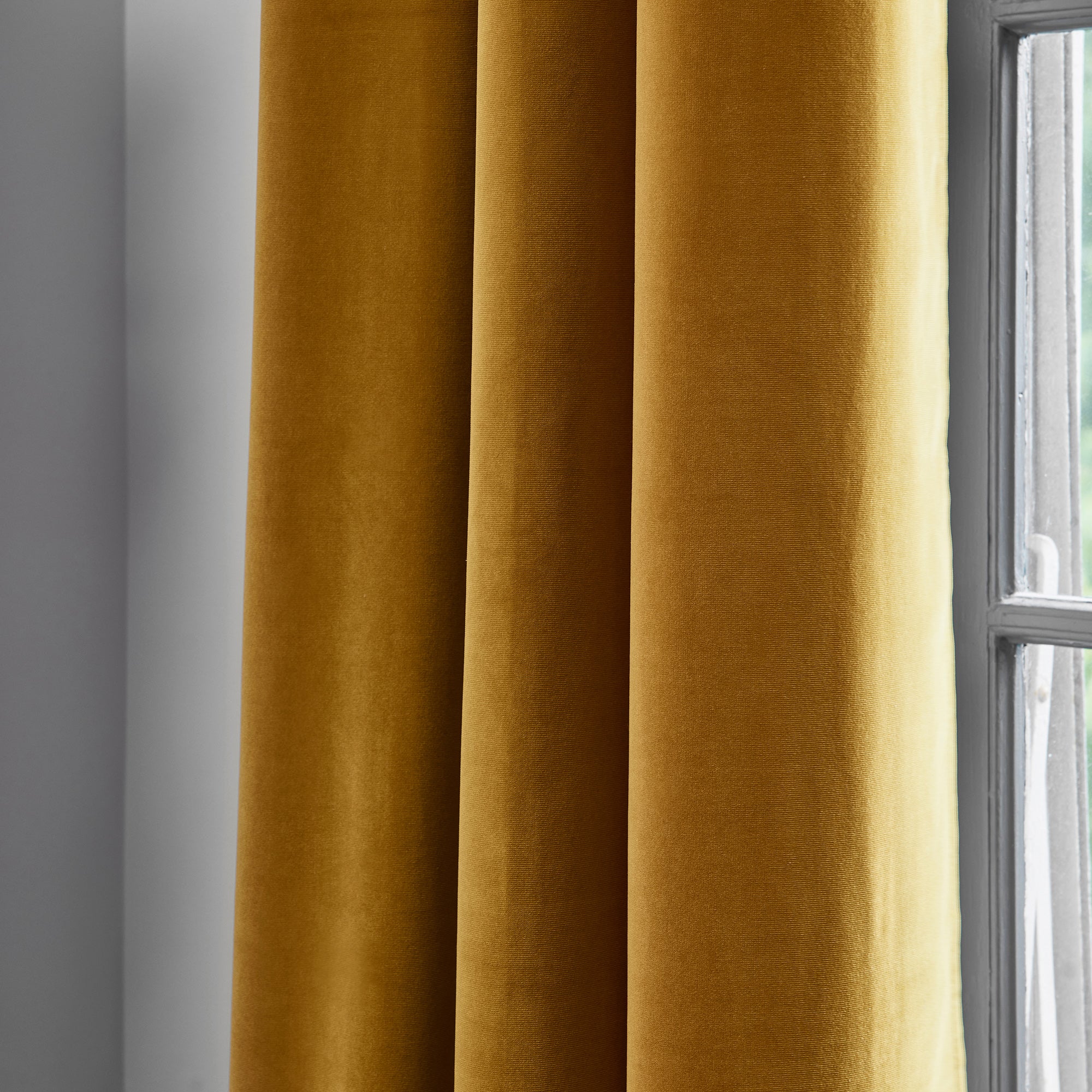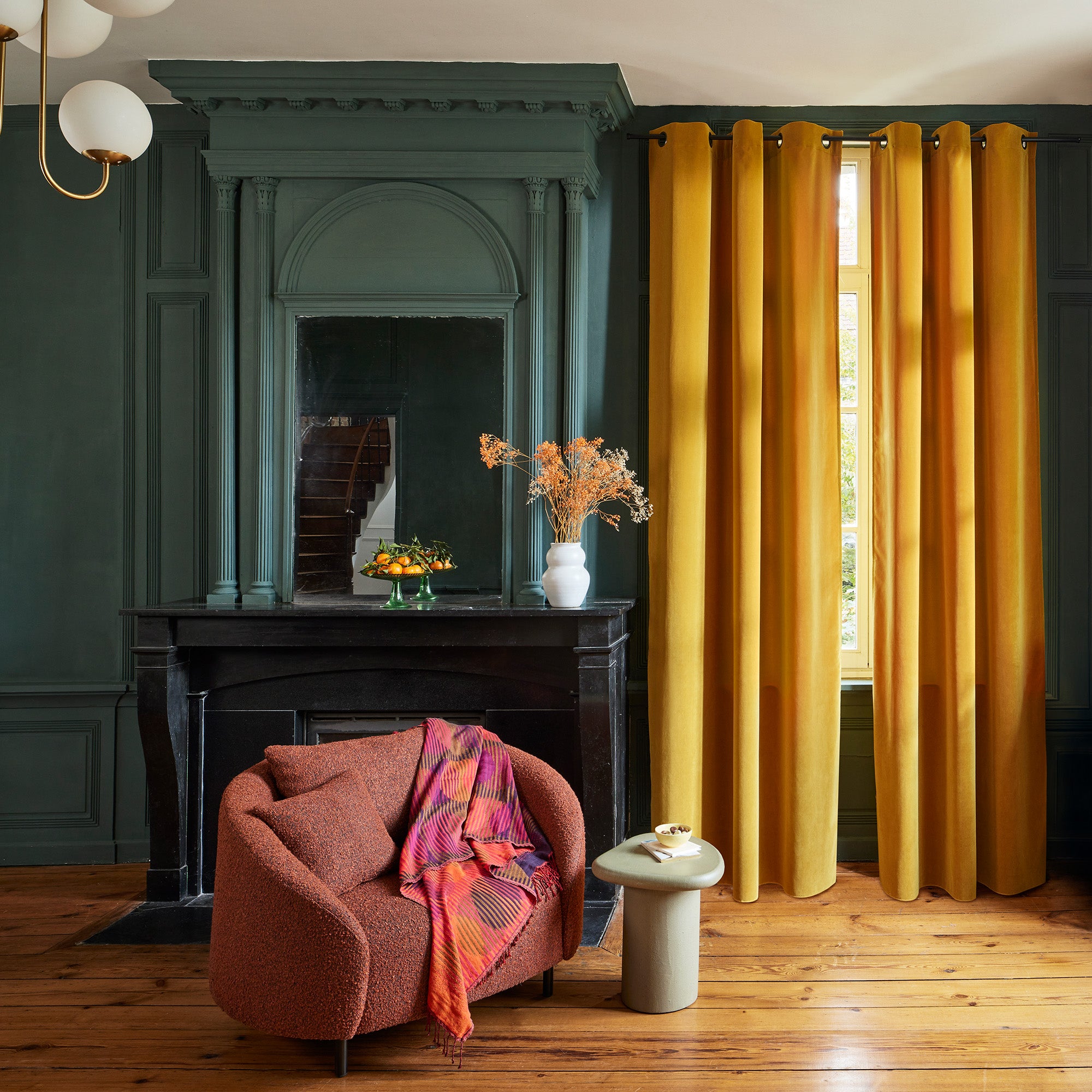 Der Samtvorhang Matia fängt das Licht ein und verleiht den warmen Ockertönen einen subtilen matten Schimmer.