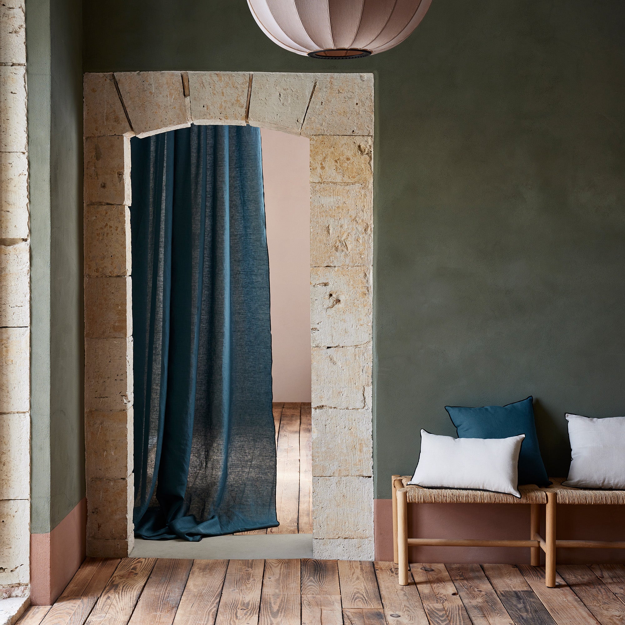 The Carlina petrol blue washed linen panel, with its black bourdon stitch highlighting its outline, is beautiful in its obvious simplicity. This light linen curtain offers a delicate undulation with both modern and bohemian charm.