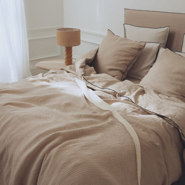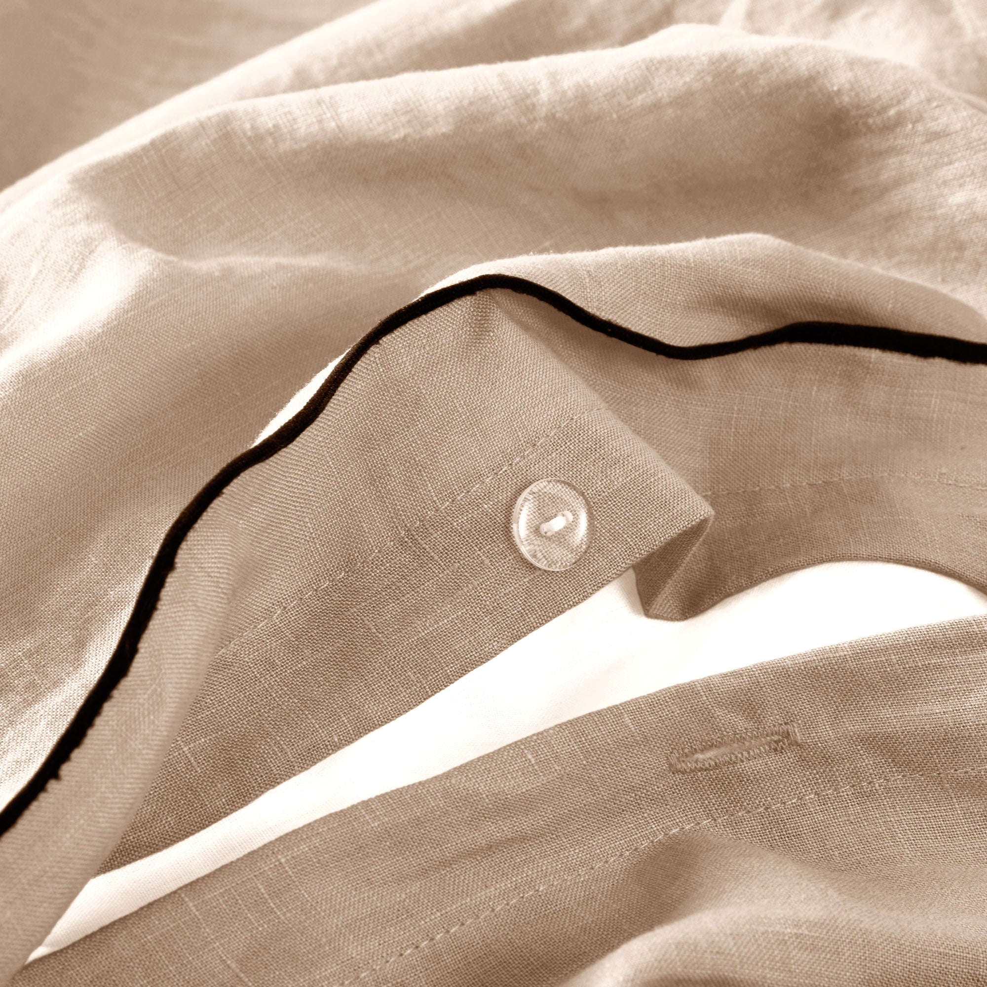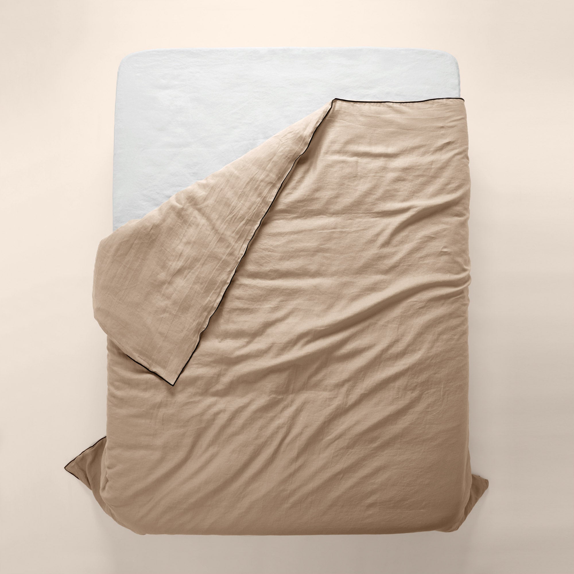 The Carlina duvet cover in light beige, enhanced by an elegant black bourdon stitch finish, is ideal for adding a natural touch to your bedrooms. This comforter cover is comfortable and easy to care for, as its fabric is non-iron! Over time and with repeated washing, the fiber will become softer and softer to the touch. Emblematic of the Madura art of living, we have paid particular attention to the selection of its 100% vegetable fiber from Europe, respectful of nature and certified Oeko-tex standard 100.
