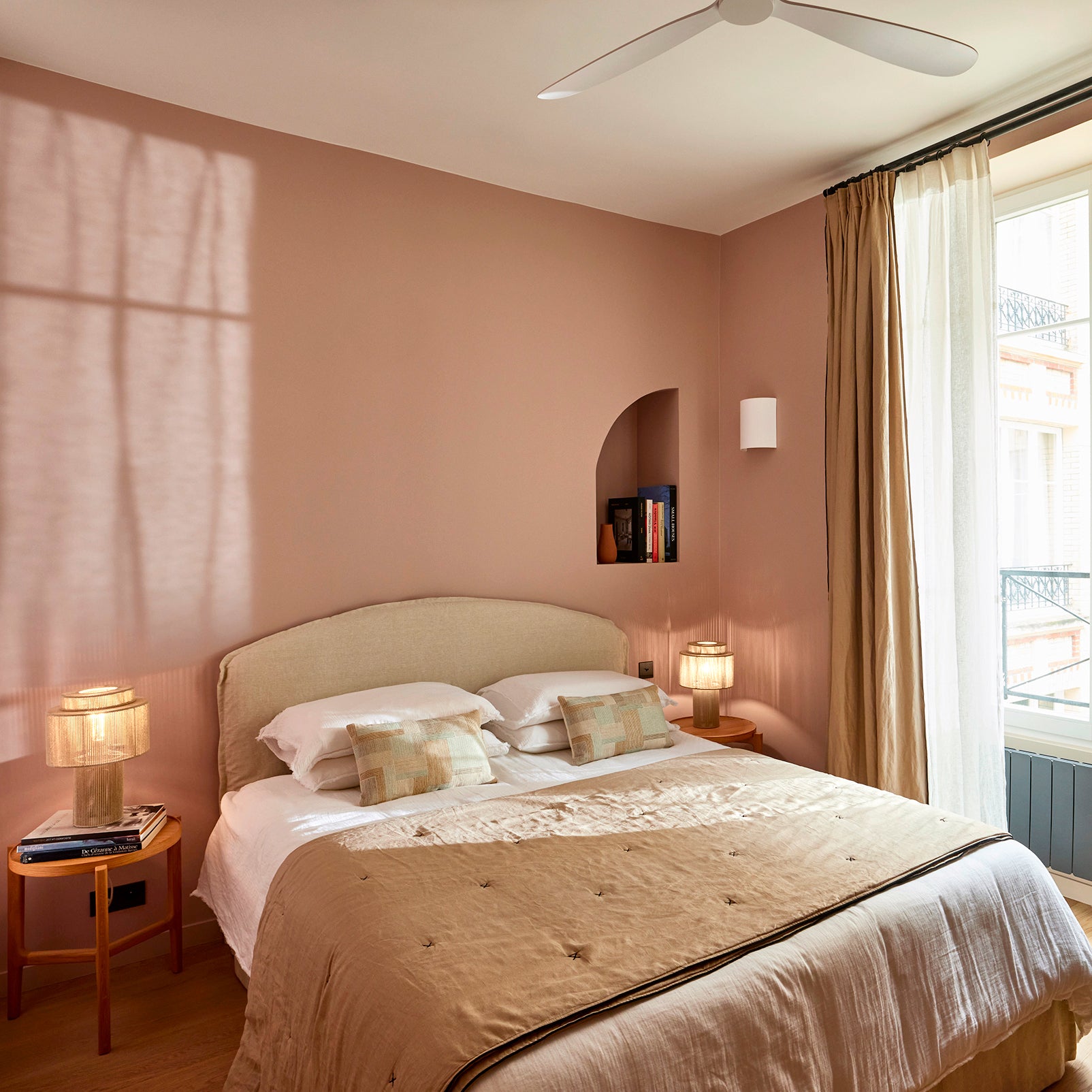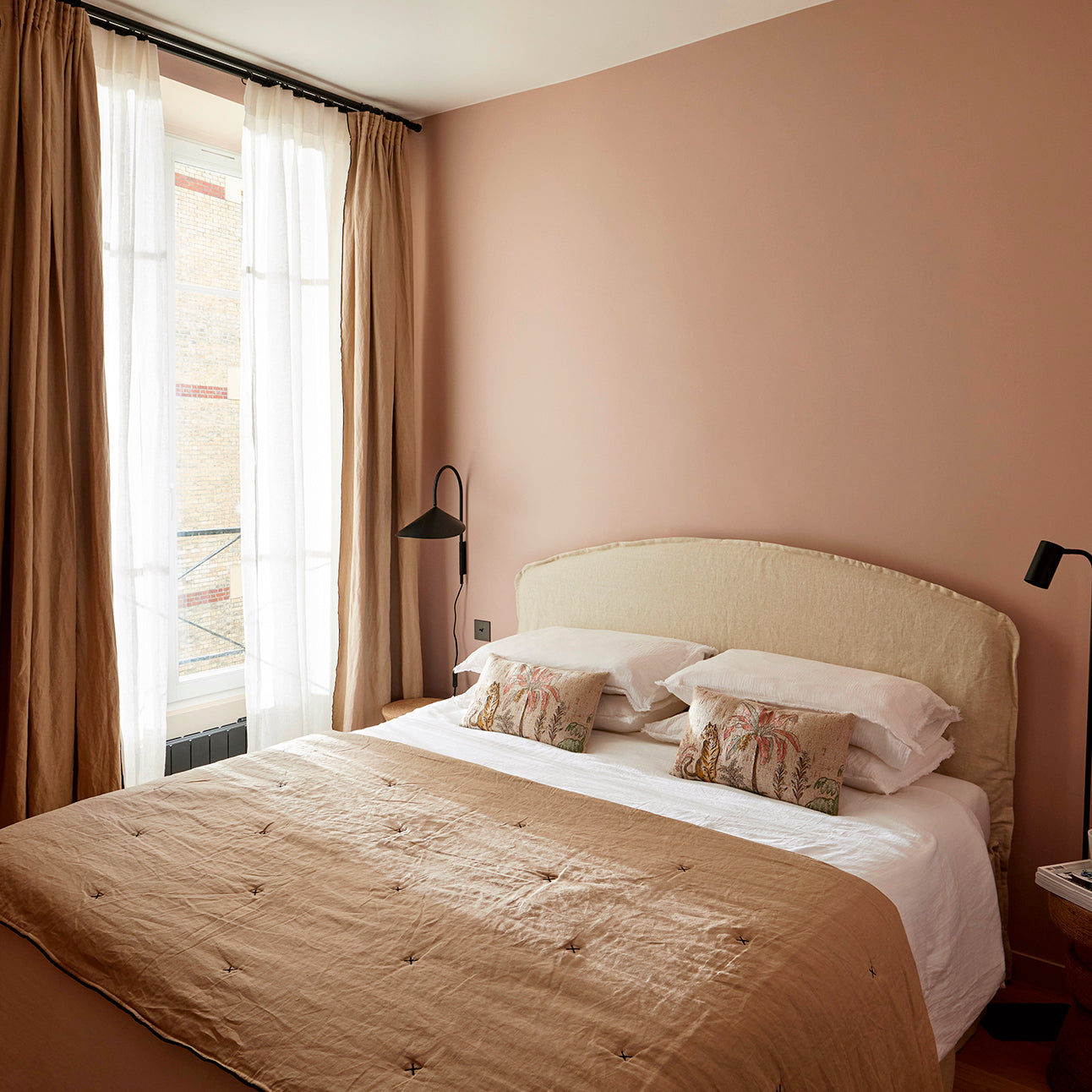 Dans chacune des trois chambres, l’approche décorative privilégie la douceur des matières, la subtilité des tons et l’exigence technique. L’ensemble du linge de lit a été sélectionné pour offrir un confort haut de gamme tout en garantissant une tenue parfaite à l’usage — un critère essentiel dans le cadre d’une location courte durée.Les rideaux jouent un rôle clé dans l’atmosphère feutrée de ces pièces nuit : doublés pour assurer une occultation optimale, ils enveloppent les fenêtres d’une texture chaleureuse, en accord avec les murs aux teintes poudrées. La superposition avec des voilages légers permet de moduler la lumière naturelle tout au long de la journée.