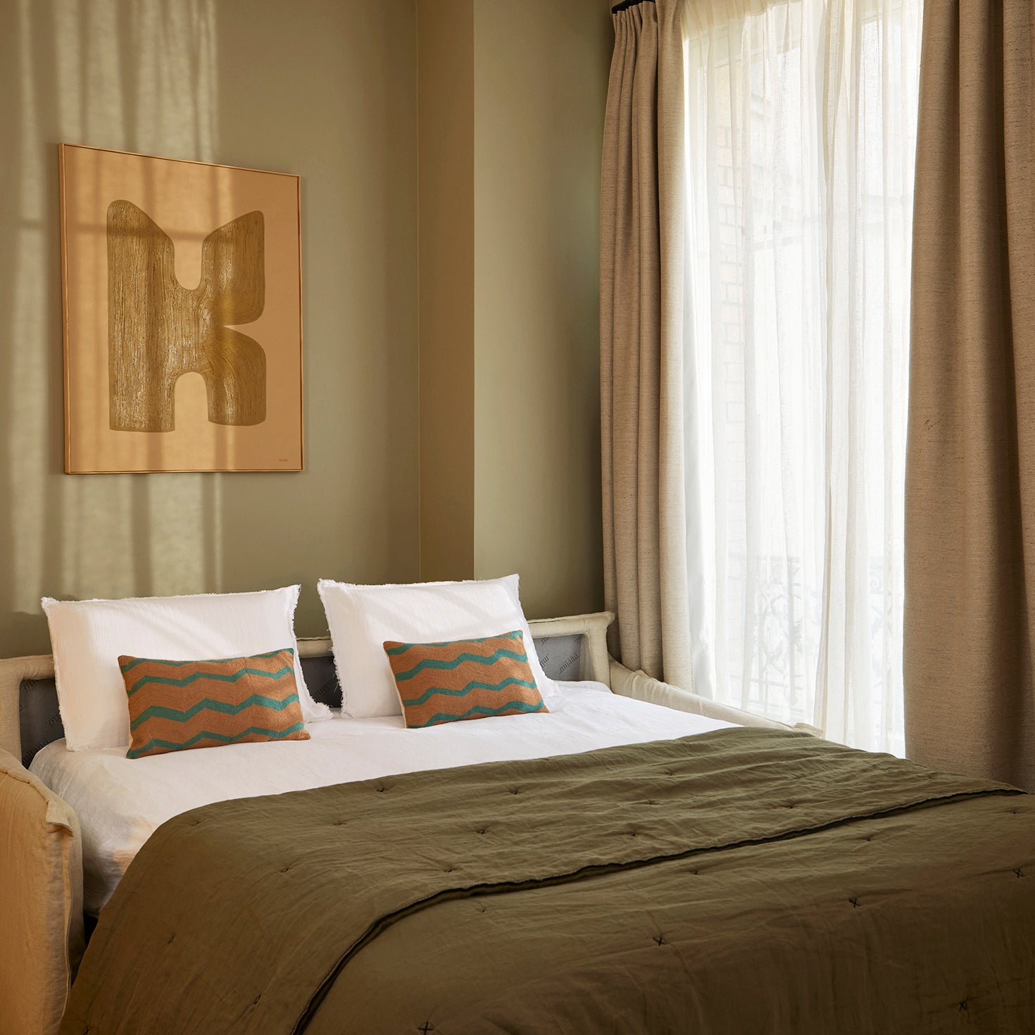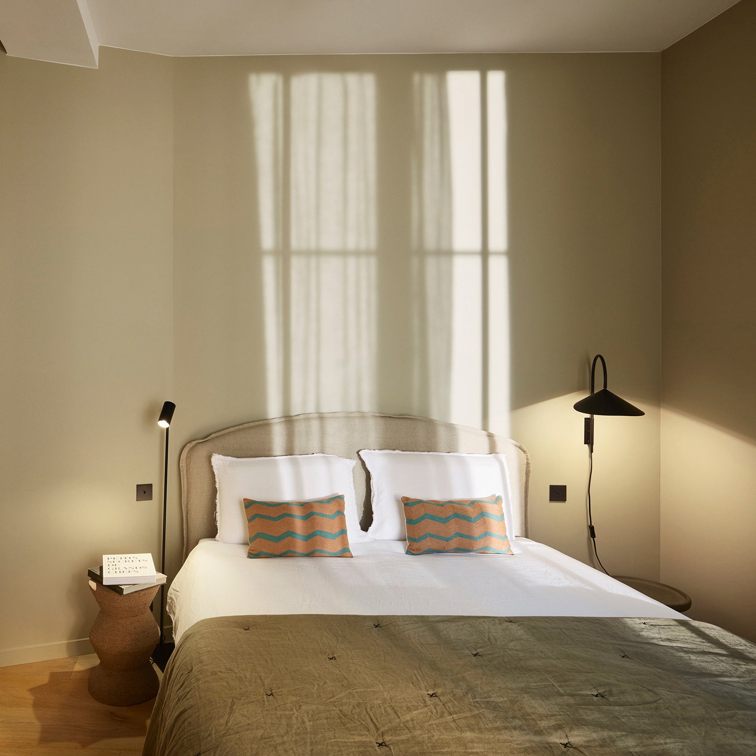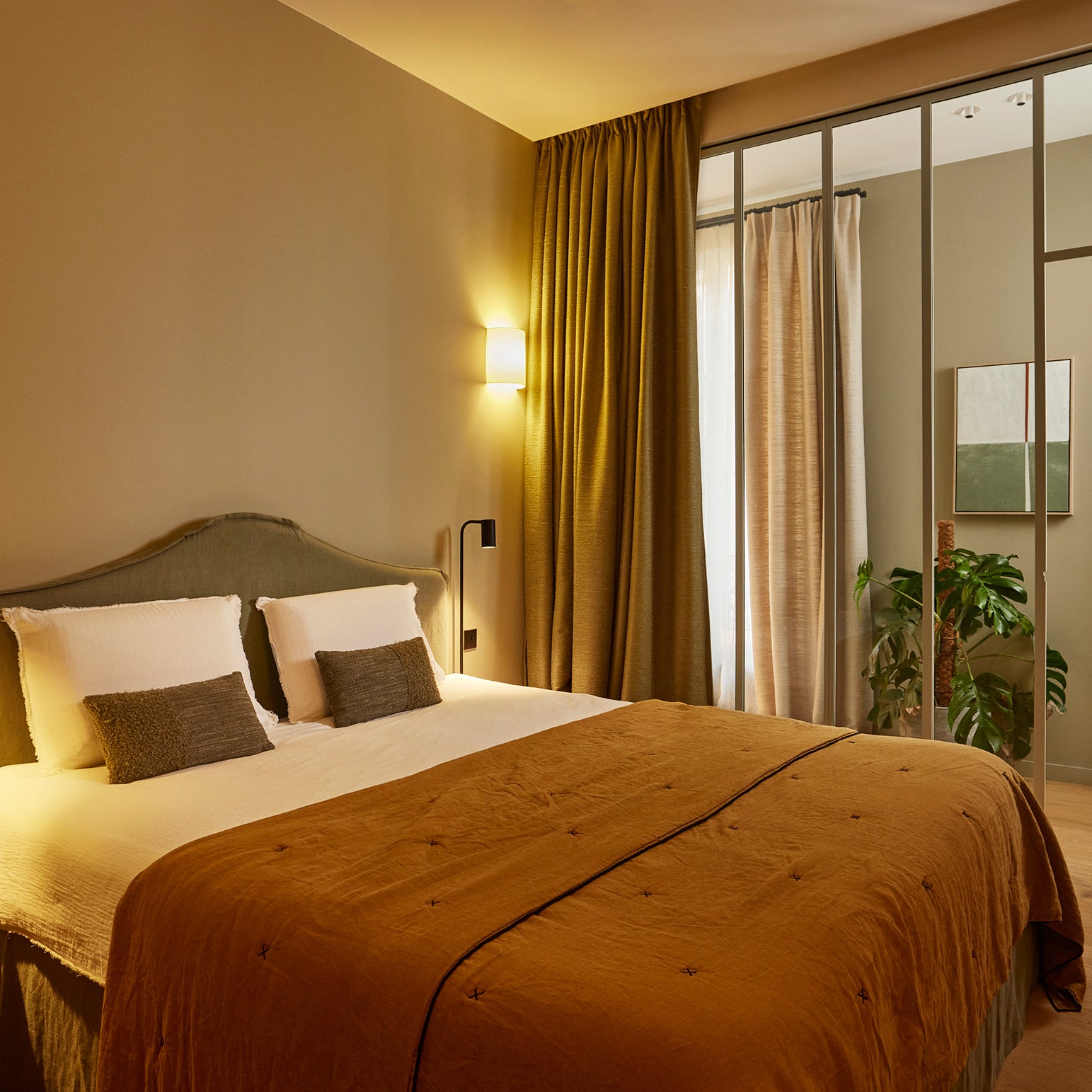 Dans les chambres, l’habillage textile joue un rôle central dans l’atmosphère du projet. Les coussins décoratifs et le linge de lit LOU en gaze de coton, assure confort et douceur aux occupants. Des doubles-rideaux occultant Orsso, en finition vert olive, posé sur un rail, ont été réalisés pour assurer l'occultation des chambres derrière les verrières.