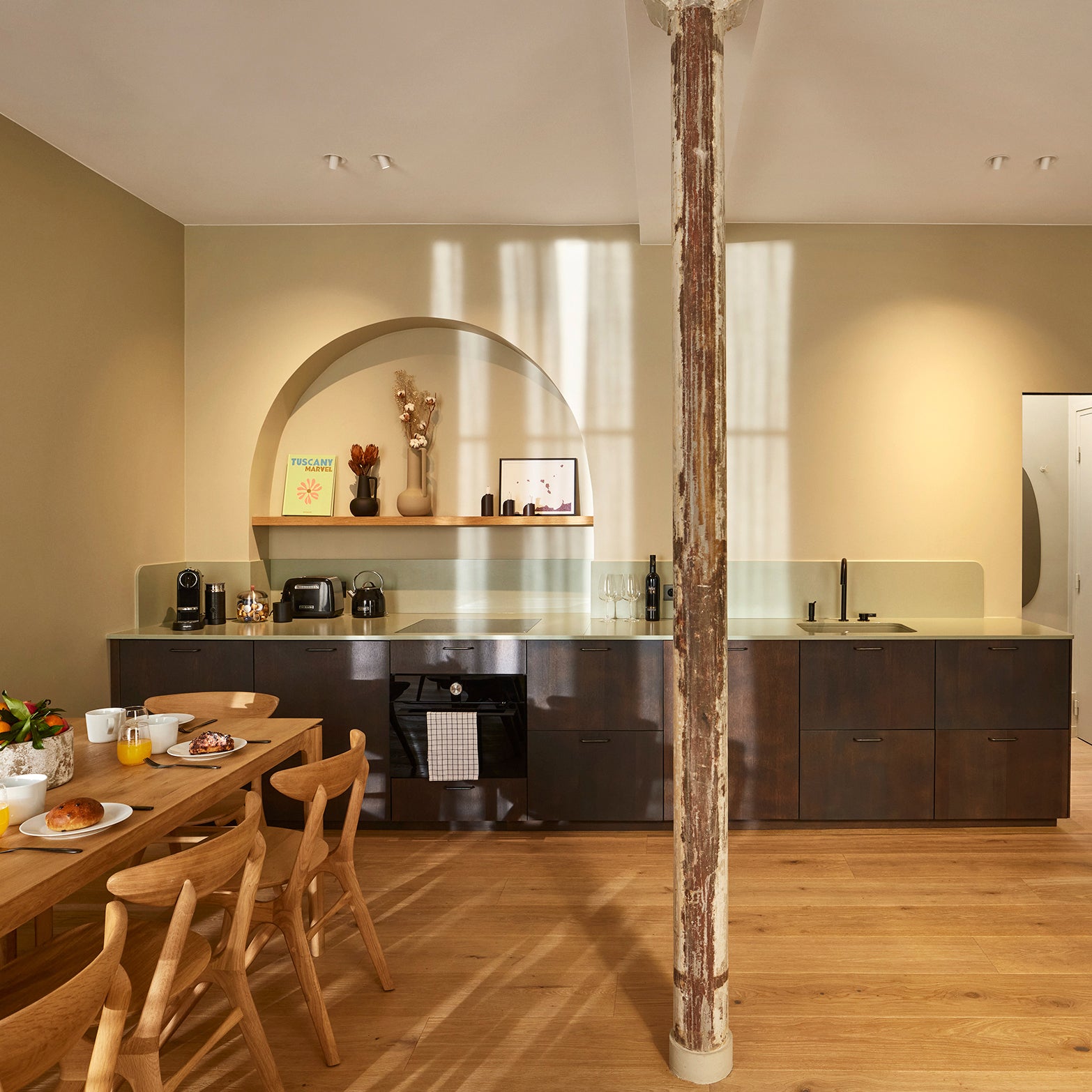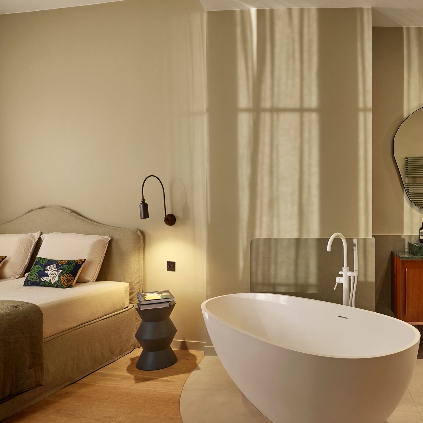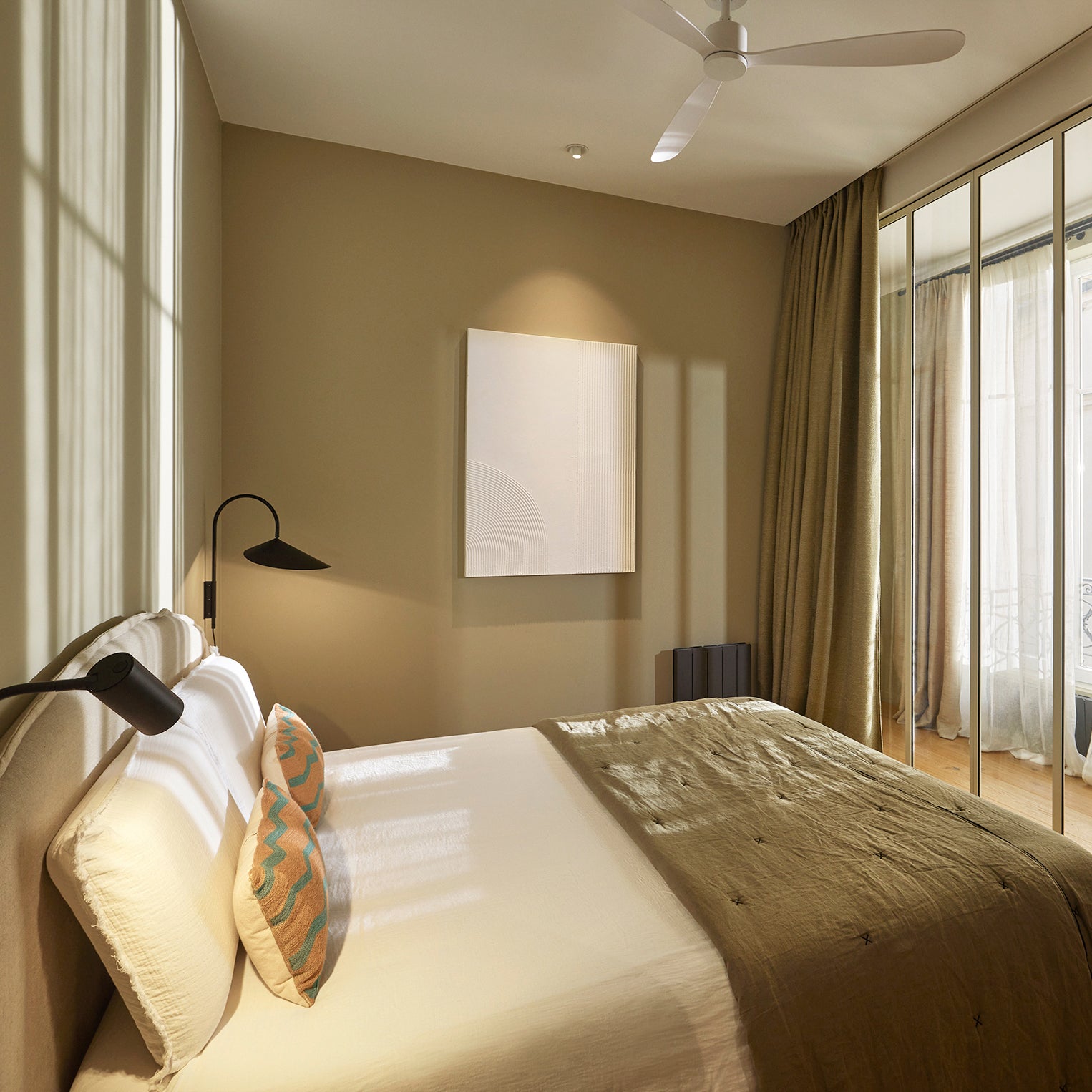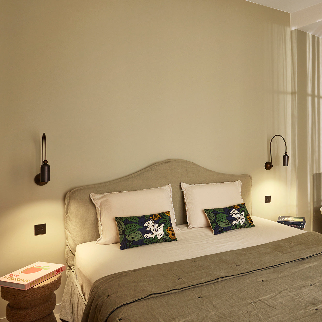 Dans les chambres, l’habillage textile joue un rôle central dans l’atmosphère du projet. Les coussins décoratifs et le linge de lit LOU en gaze de coton, assure confort et douceur aux occupants. Des doubles-rideaux occultant Orsso, en finition vert olive, posé sur un rail, ont été réalisés pour assurer l'occultation des chambres derrière les verrières.