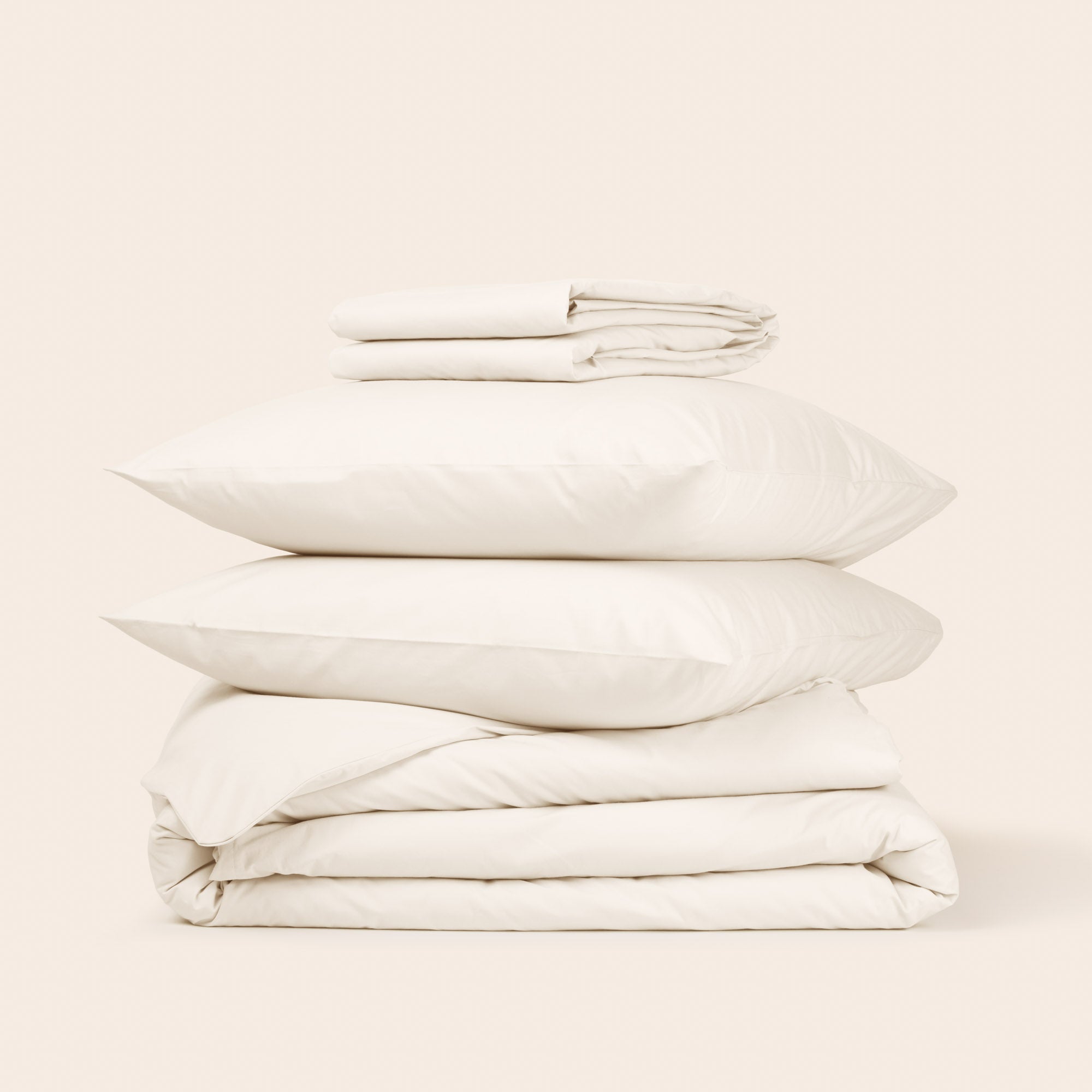 Oprollen in Céliane katoenen perkal bedlinnen belooft een zachte, verkwikkende nachtrust.