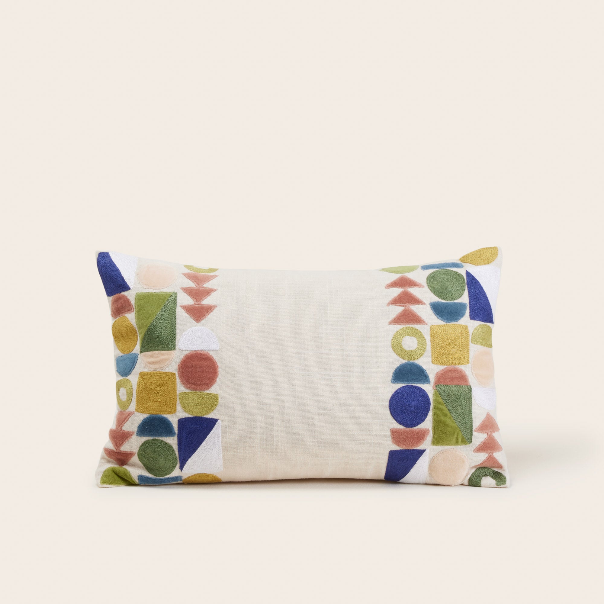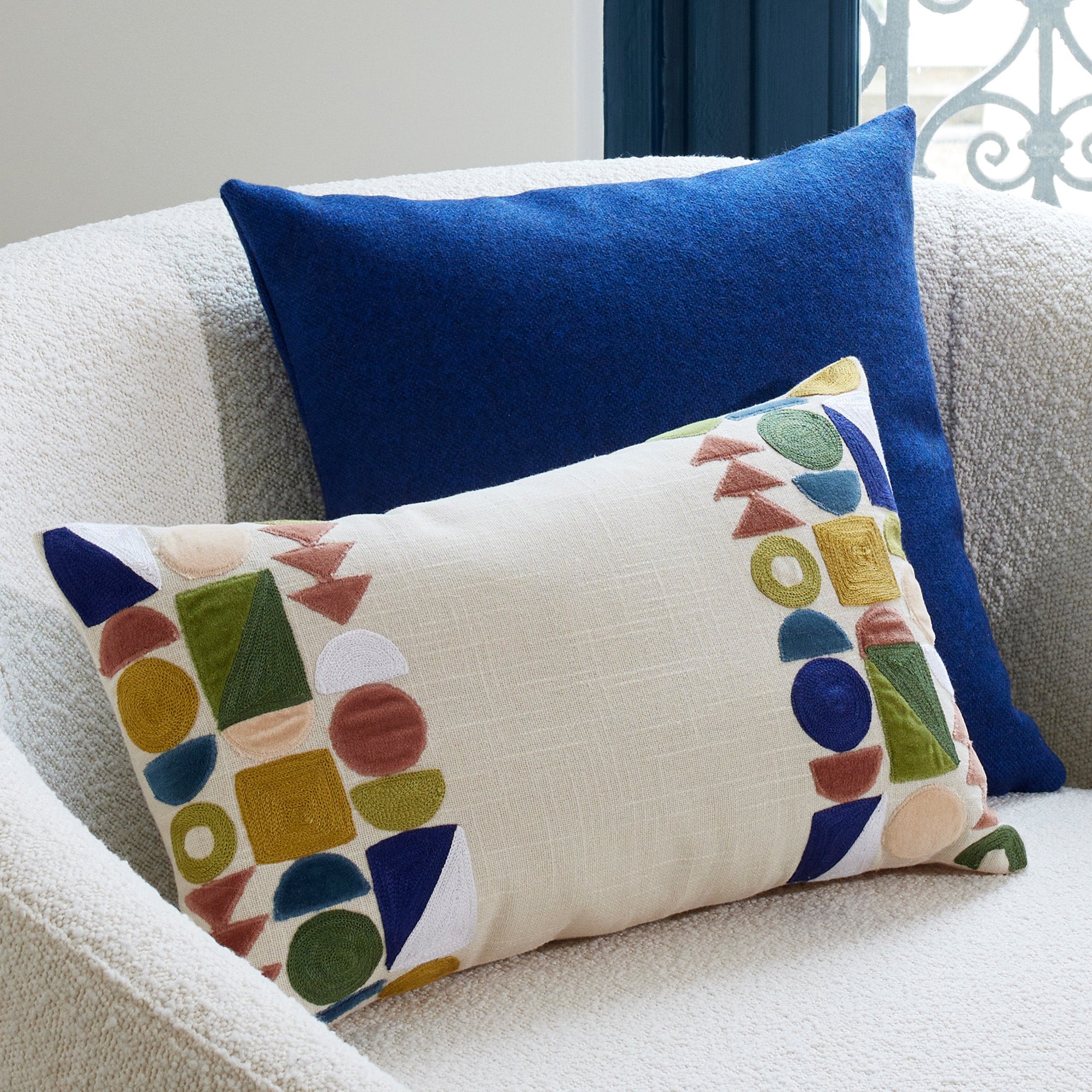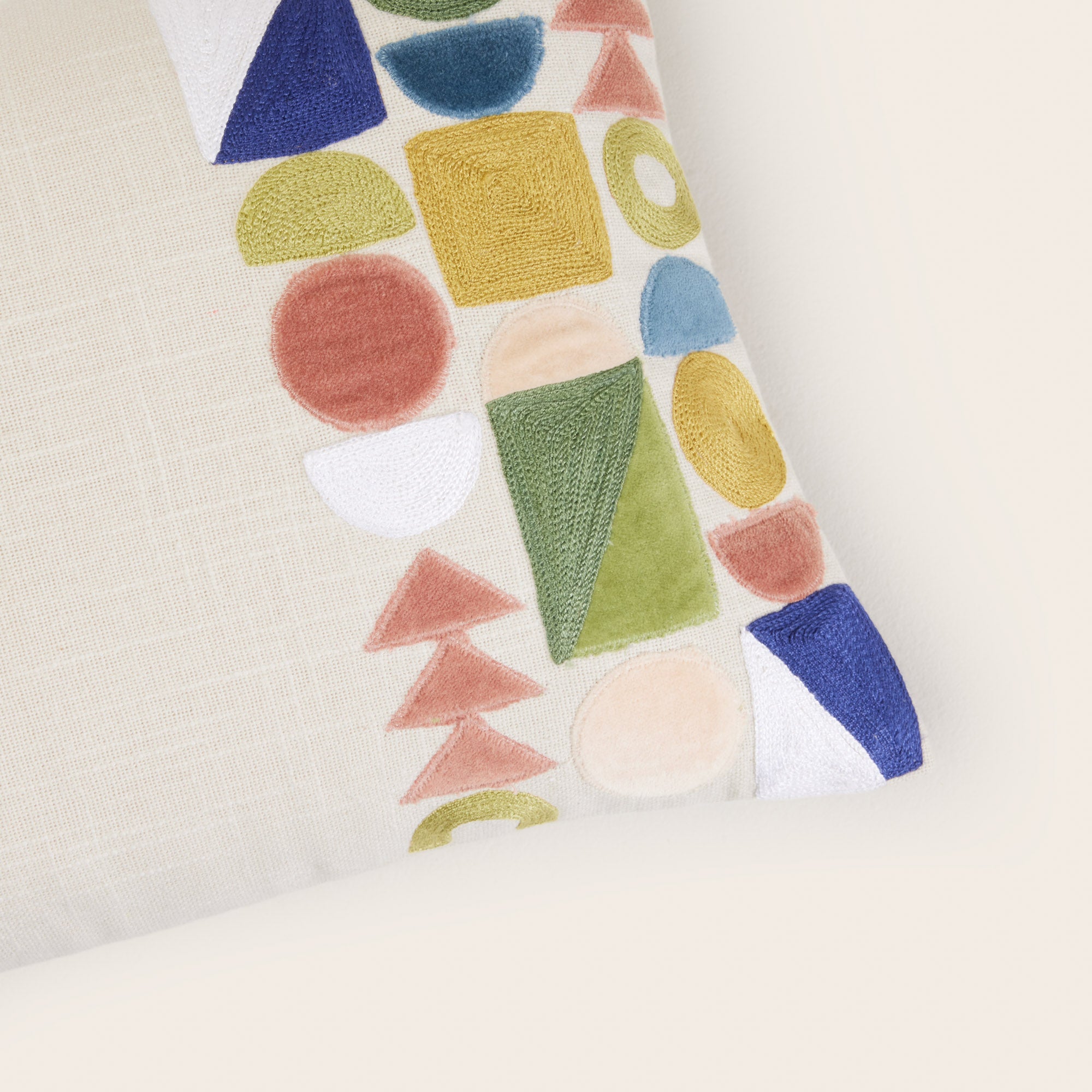 Het geometrische patroon is gemaakt door 2 technieken te combineren: kettingsteekborduurwerk en felgekleurde katoenen fluwelen applicaties. Dandelin past perfect bij onze linnen en fluwelen collecties. Met natuurlijke tinten om het te benadrukken en de kleuren naar voren te brengen, of met sterke tinten zoals kobaltblauw of olijfgroen voor een meer assertieve, eigentijdse stijl.