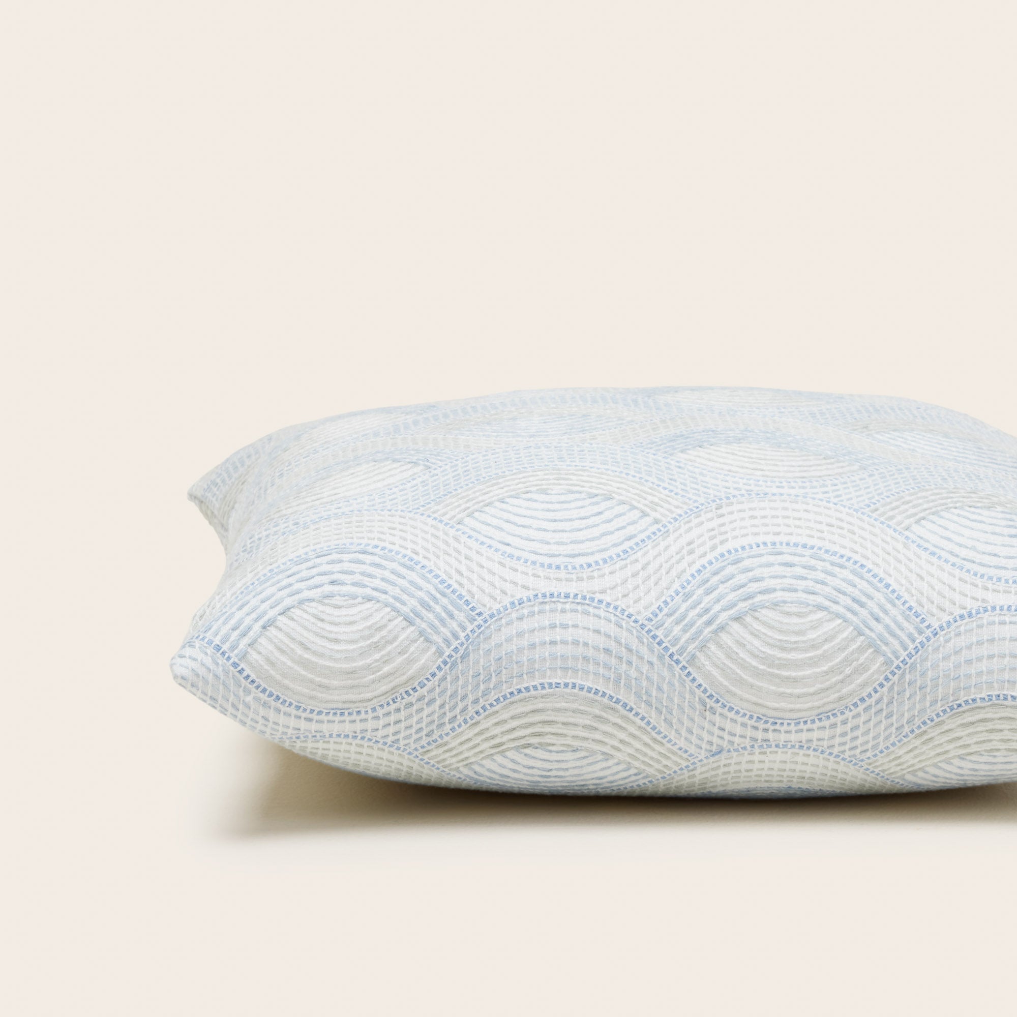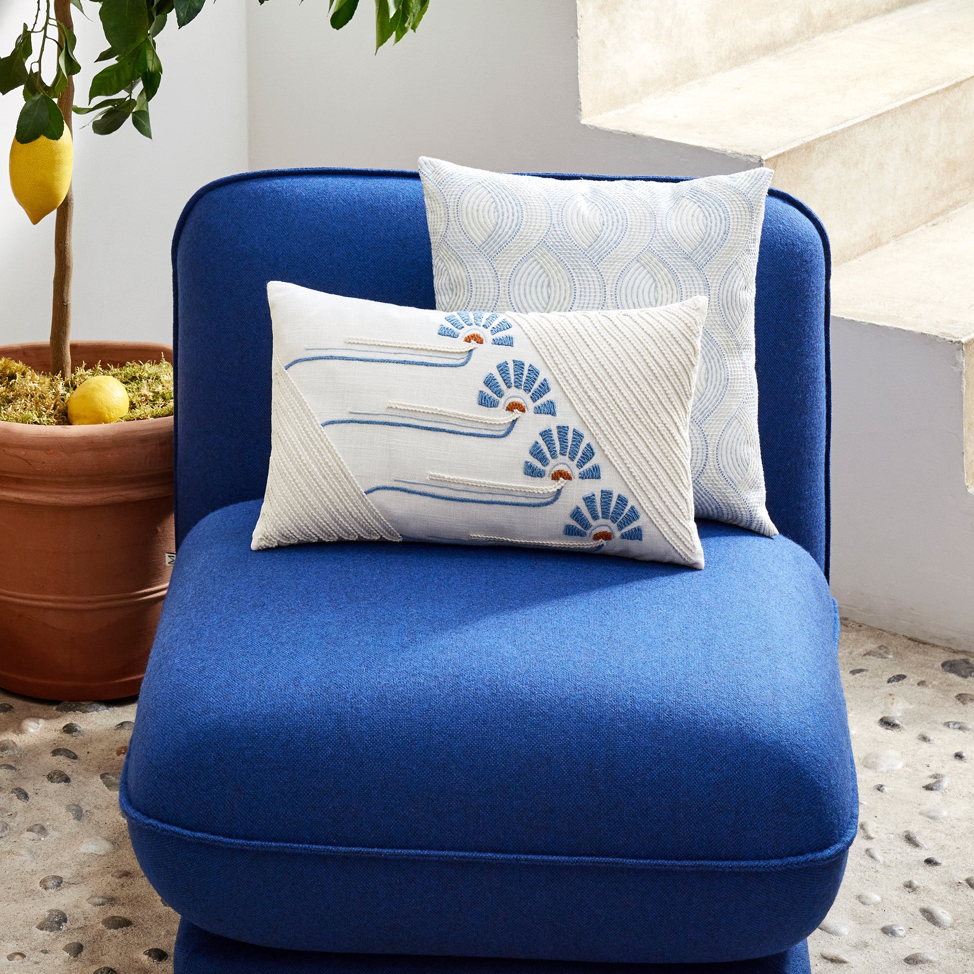 Deze kussenhoes vangt de ziel van de Griekse eilanden met zijn geborduurde golfpatroon en nodigt uit tot rustgevende sensaties in je huis.