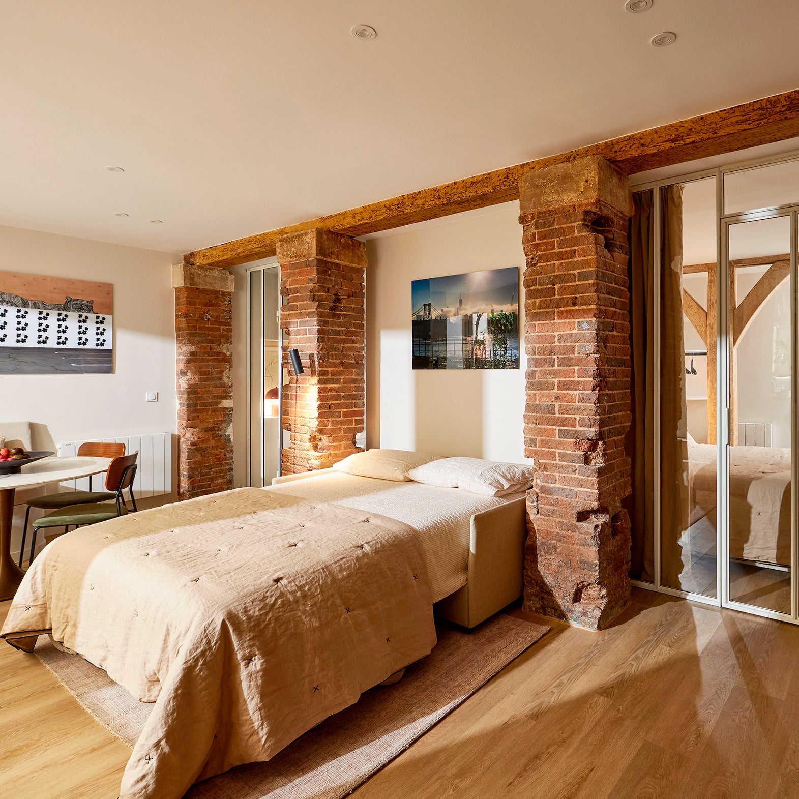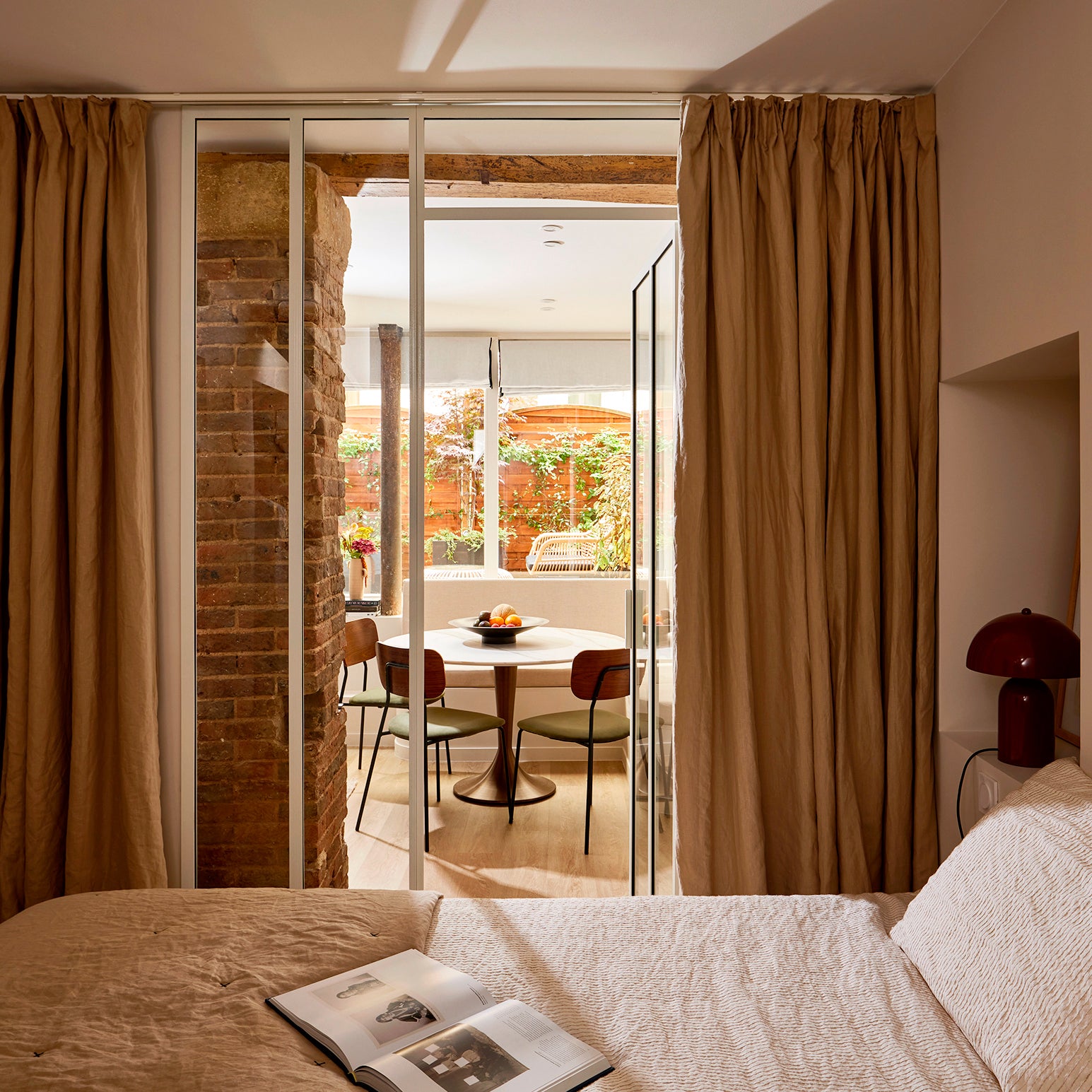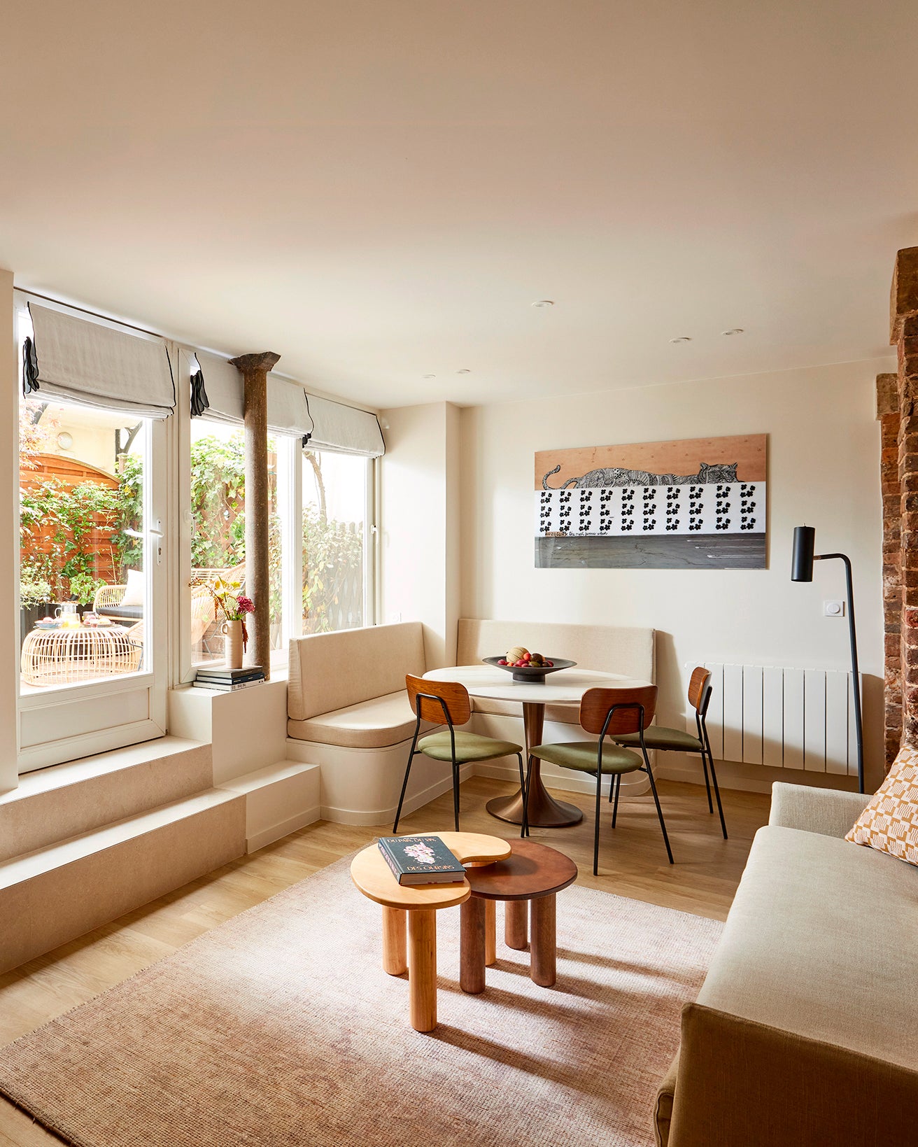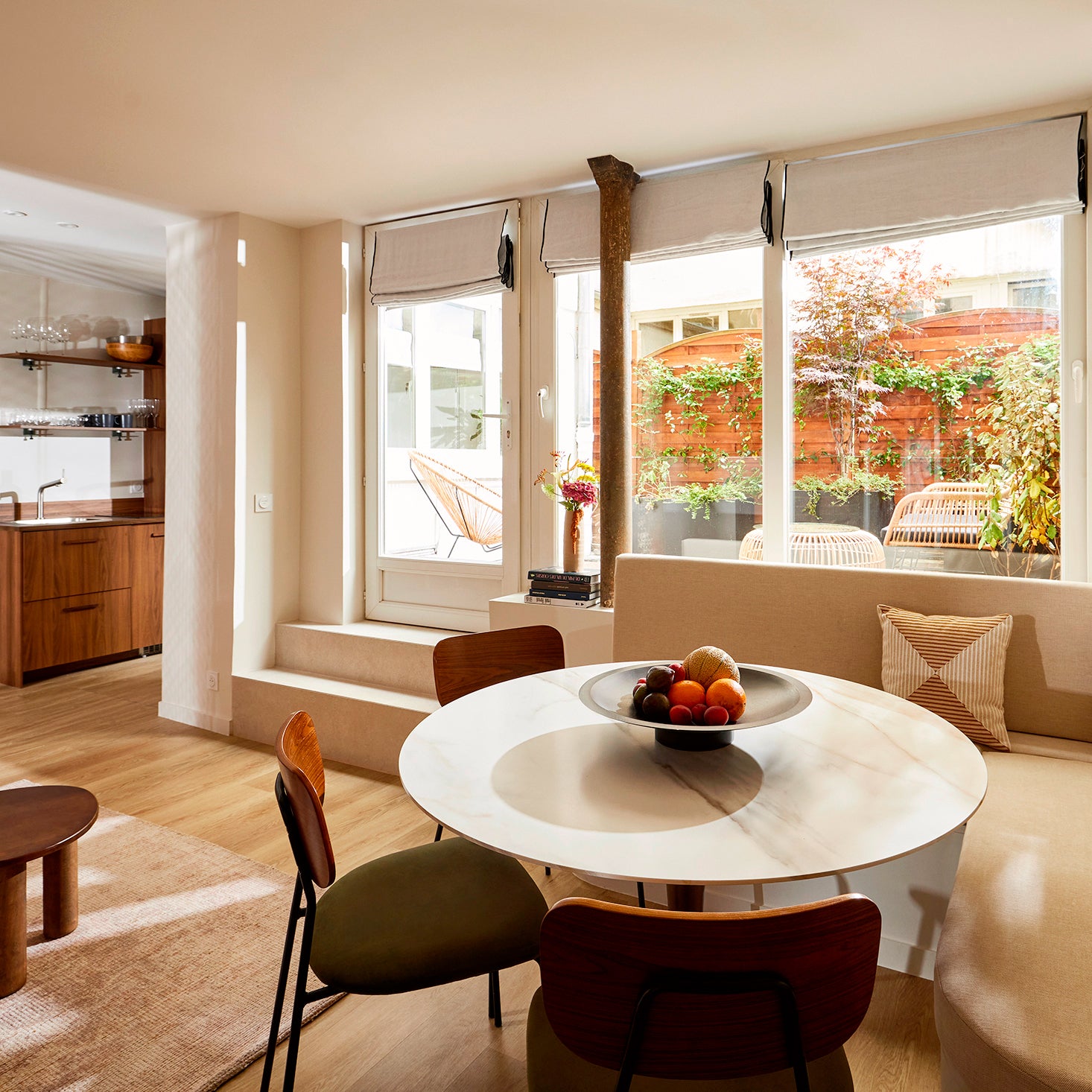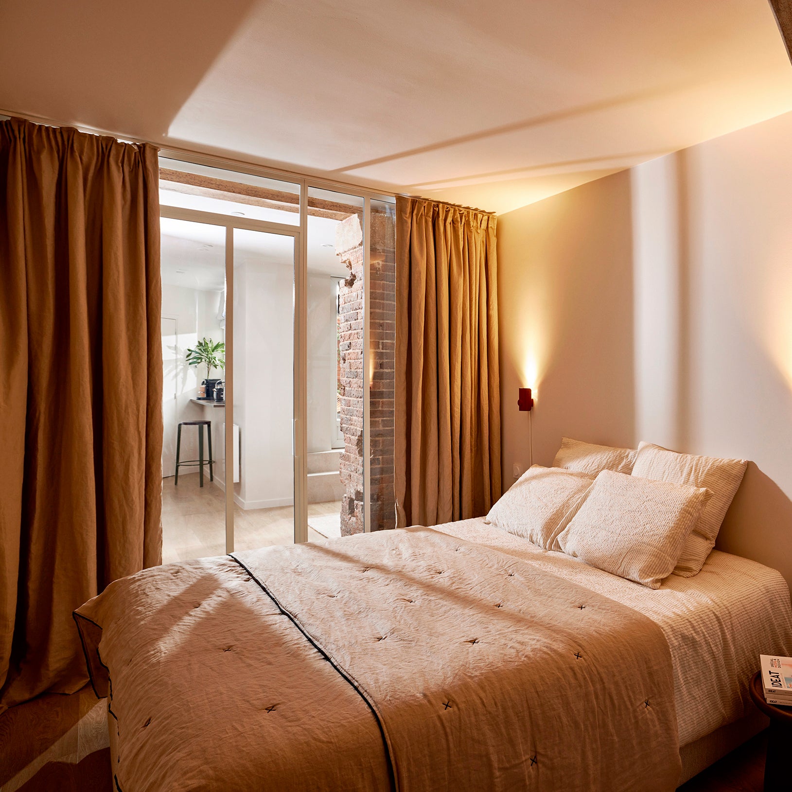 Ces anciens bureaux, entièrement repensés en meublé de tourisme, séduisent par leur luminosité et la qualité raffinée de la rénovation. Situé en rez-de-jardin, cet appartement bénéficie d’un rare îlot de verdure en plein cœur de Paris, qui participe pleinement à son atmosphère apaisante.En collaboration avec l’architecte, Madura a contribué à insuffler du style et du confort à chaque pièce, grâce à une sélection sur mesure de textiles et d’accessoires pensés pour conjuguer esthétique, durabilité et fonctionnalité.