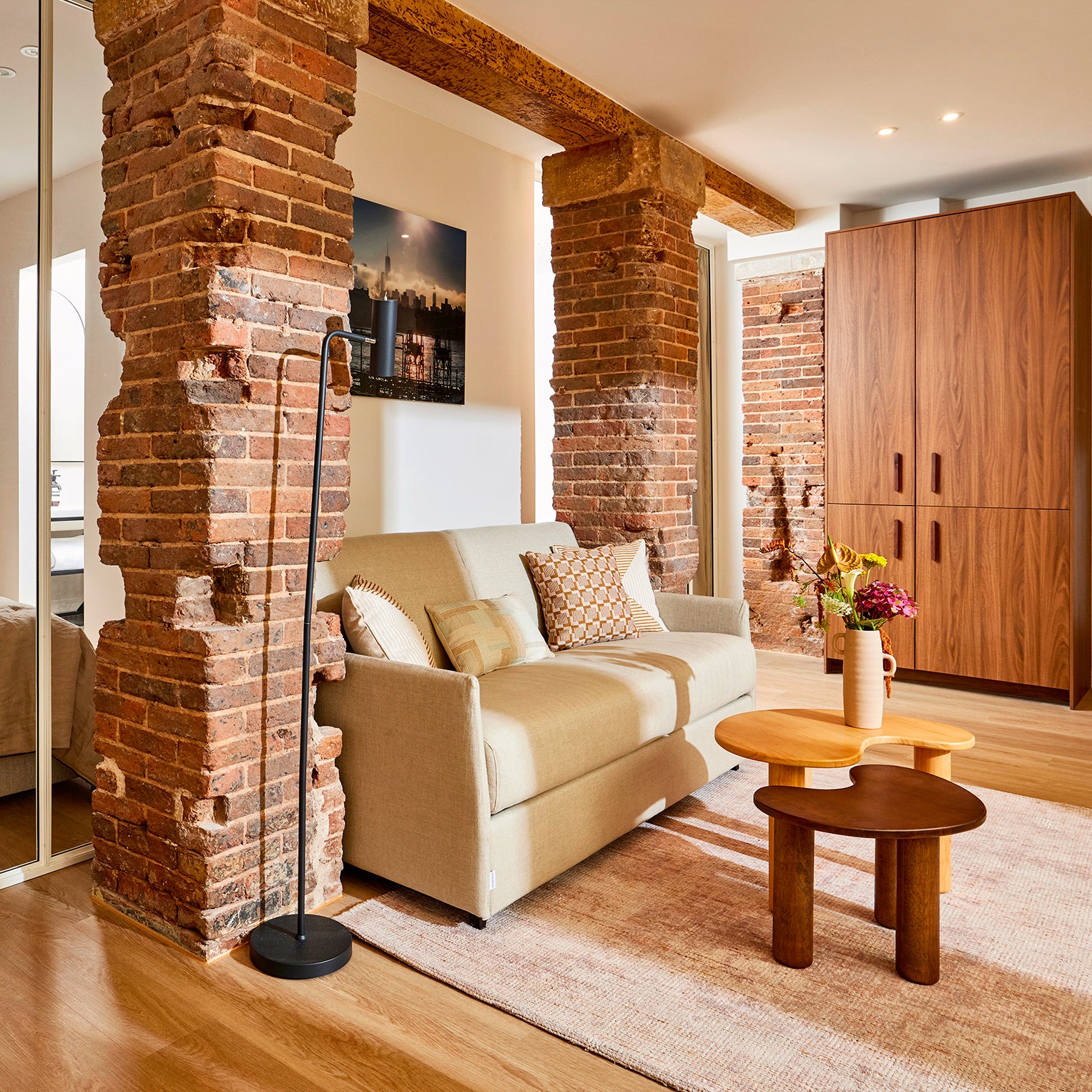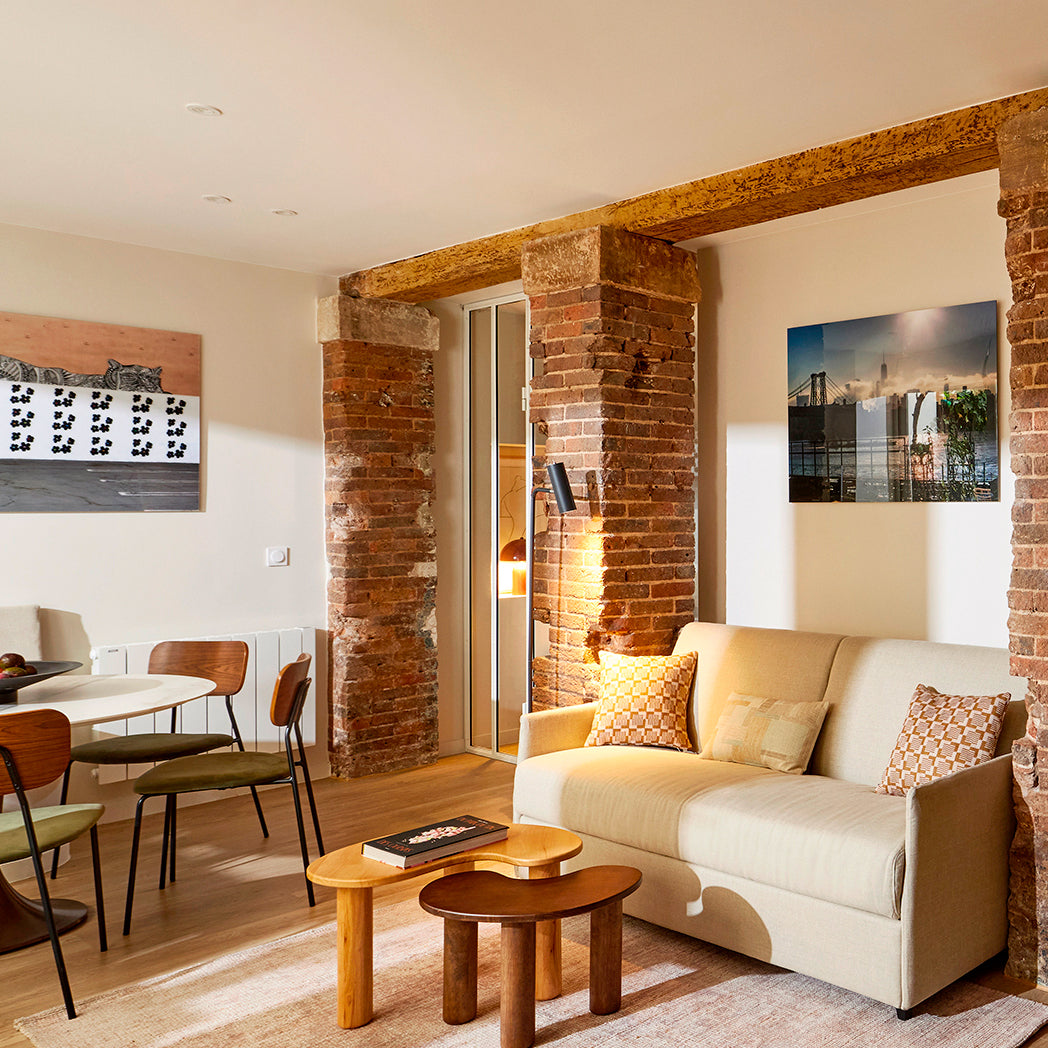 L’espace salon a été optimisé avec une banquette sur mesure et un canapé-lit habilement intégré, permettant une transformation fluide en espace nuit. Pour garantir l’occultation nécessaire, des stores bateaux Carlina, en version occultante, ont été installés. Le coussin Vitorio, choisi pour ses nuances minérales, fait écho aux tonalités de la pierre brute et s’intègre harmonieusement à l’ambiance chaleureuse et texturée du lieu.