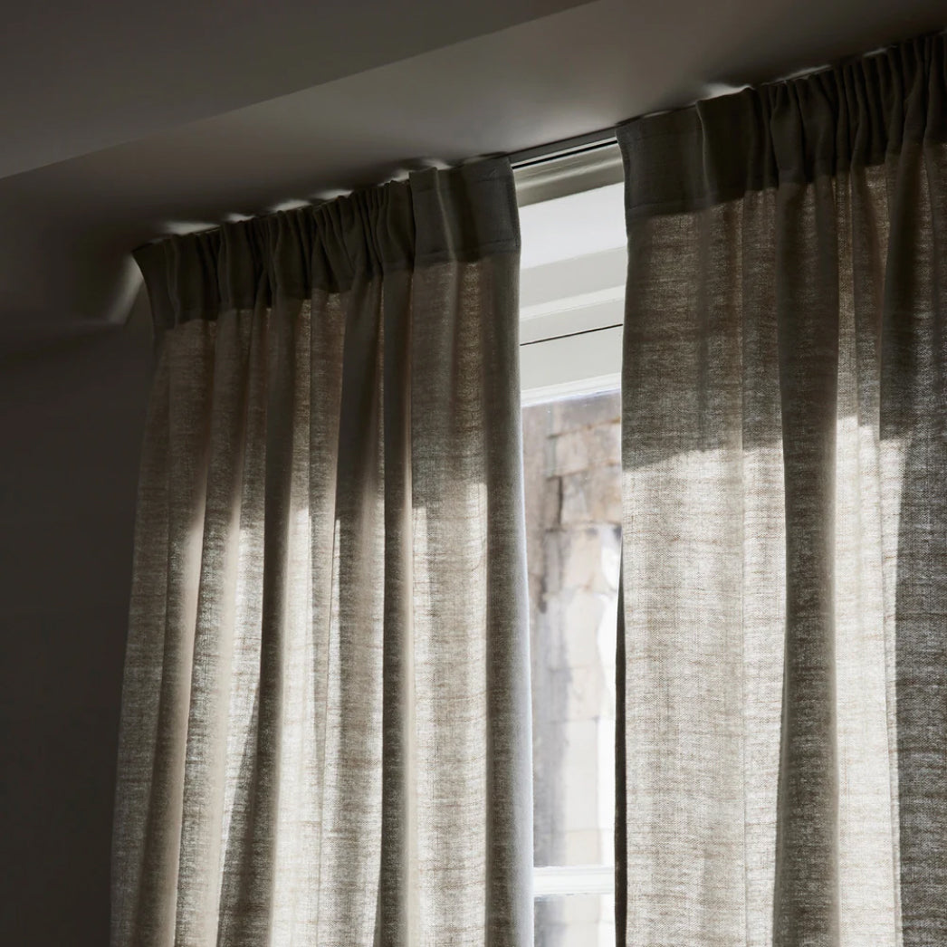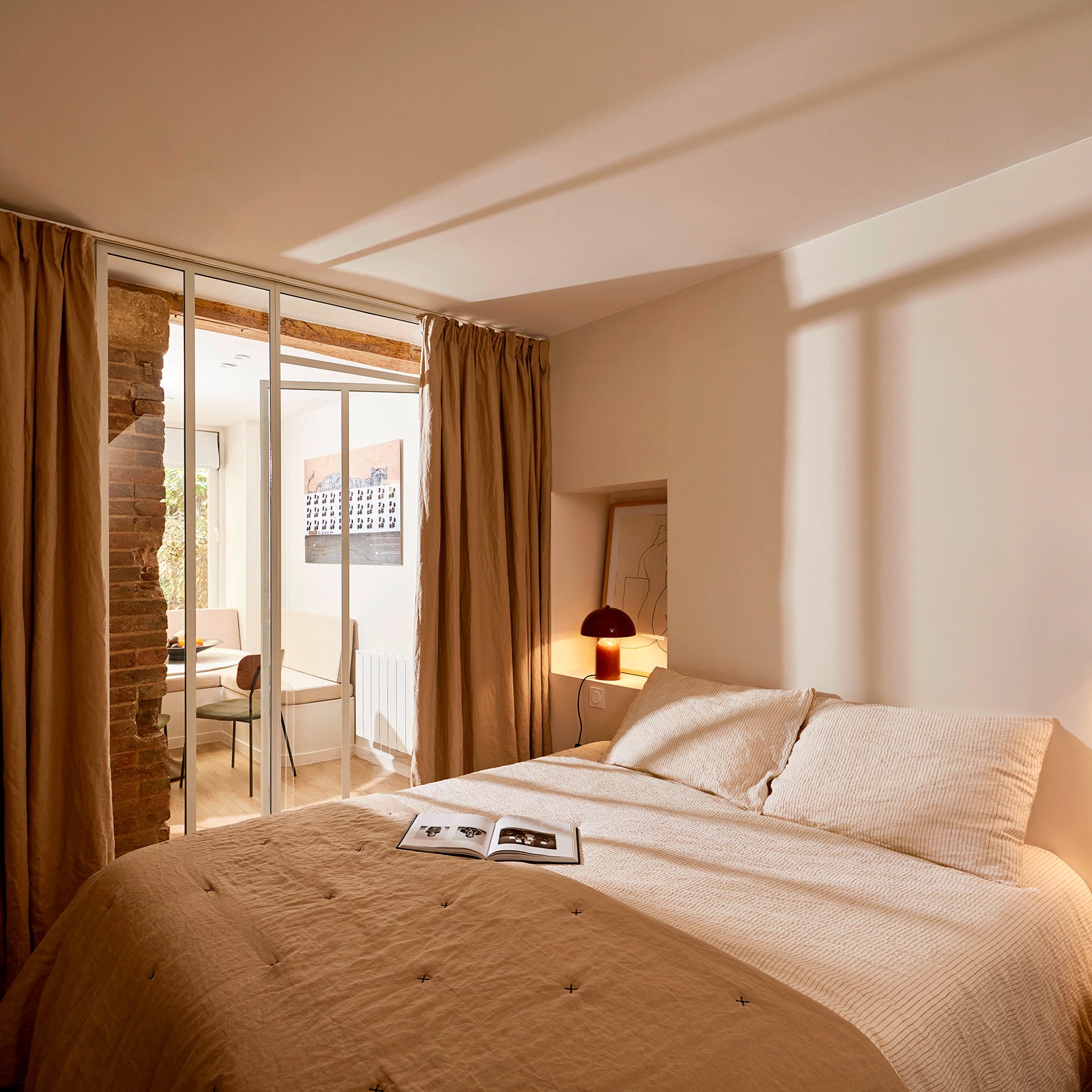 Symétriques et particulièrement accueillantes, les deux chambres sont séparées du salon par une verrière, garantissant à la fois transparence et intimité. Pour renforcer le confort visuel et assurer une occultation efficace, un somptueux rideau Carlina doublé occultant a été installé sur rail, offrant une manipulation fluide et silencieuse.Le linge de lit Élie, sélectionné pour sa texture subtile et sa palette en harmonie avec les teintes naturelles de l’appartement, parachève l’atmosphère apaisante de ces espaces nuit.