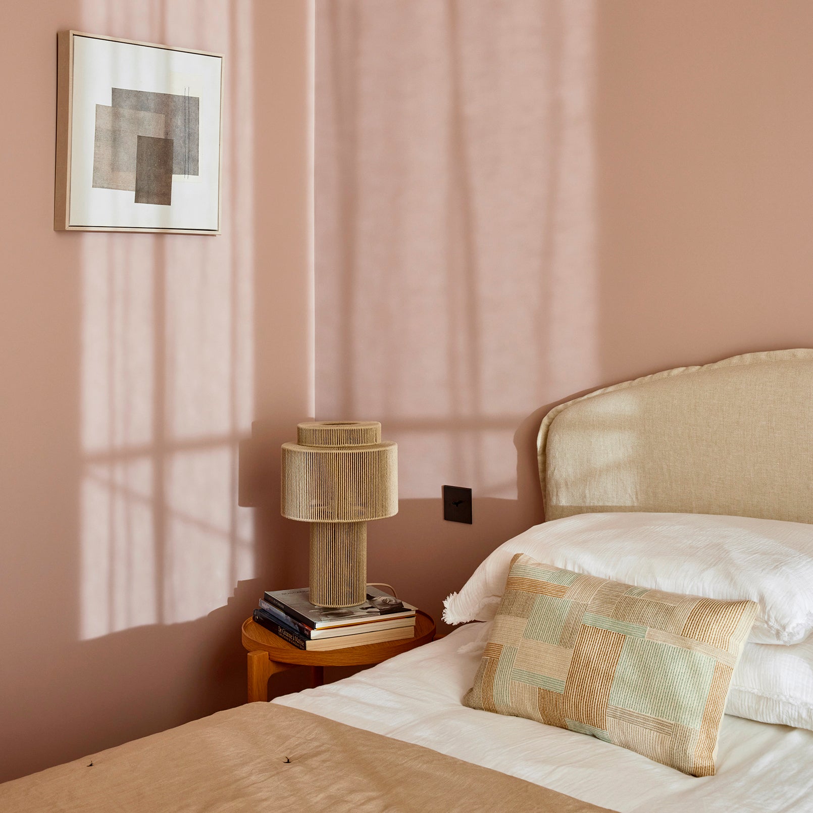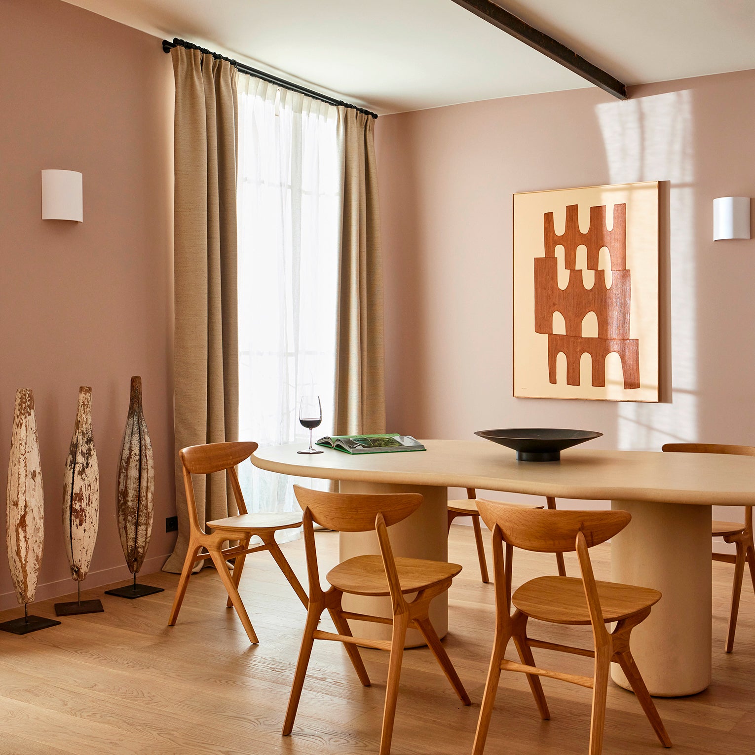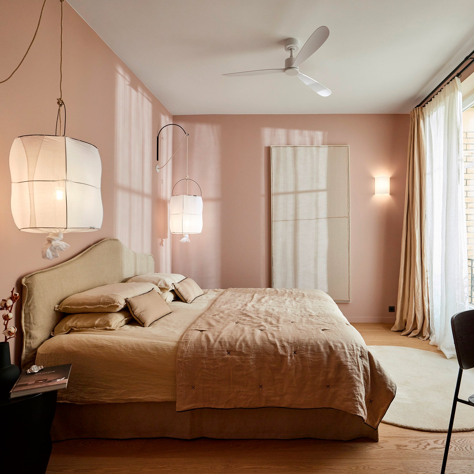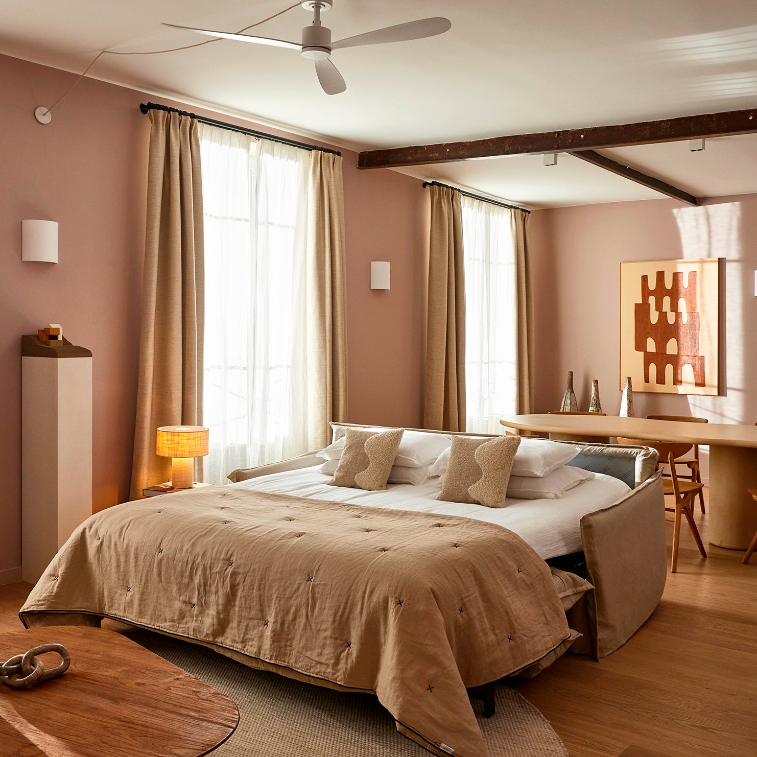 Dans chacune des trois chambres, l’approche décorative privilégie la douceur des matières, la subtilité des tons et l’exigence technique. L’ensemble du linge de lit a été sélectionné pour offrir un confort haut de gamme tout en garantissant une tenue parfaite à l’usage — un critère essentiel dans le cadre d’une location courte durée.Les rideaux jouent un rôle clé dans l’atmosphère feutrée de ces pièces nuit : doublés pour assurer une occultation optimale, ils enveloppent les fenêtres d’une texture chaleureuse, en accord avec les murs aux teintes poudrées. La superposition avec des voilages légers permet de moduler la lumière naturelle tout au long de la journée.