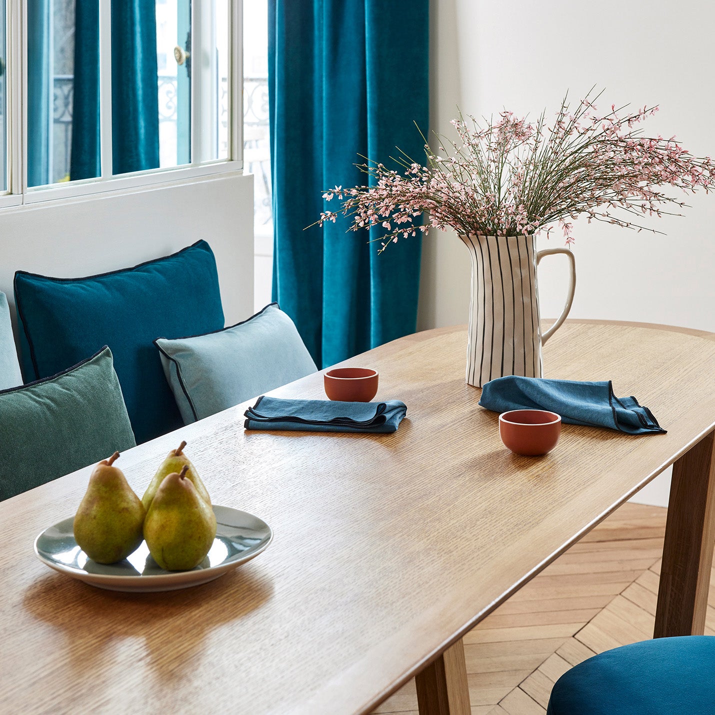 Par son toucher velours ultra doux, la housse de coussin Dario bleu topaze finie d'un point de bourdon noir contrasté, est l'élément indispensable d'une décoration raffinée et intemporelle.