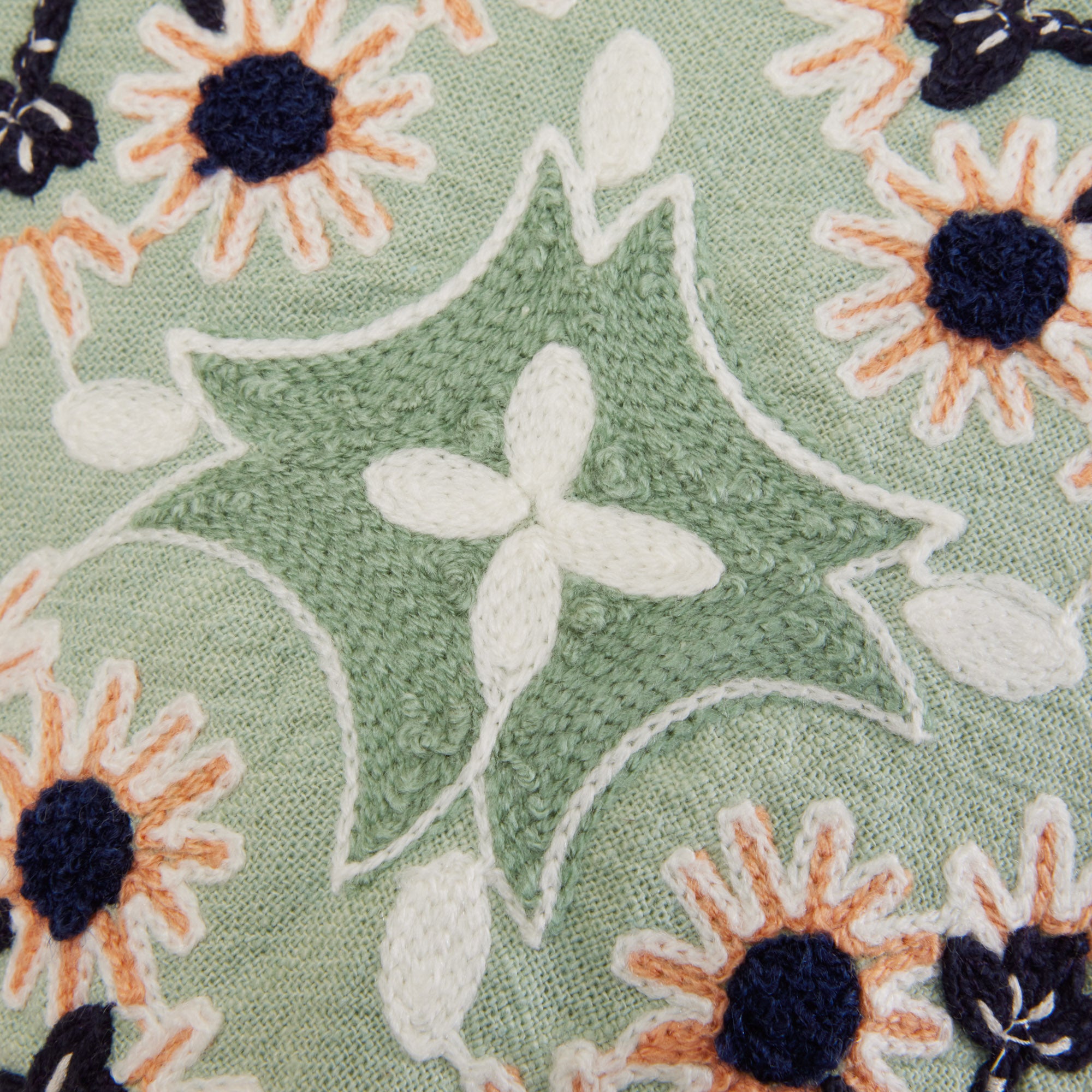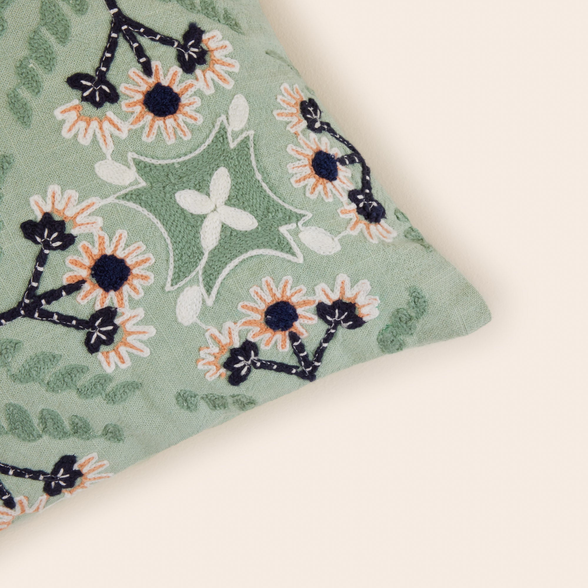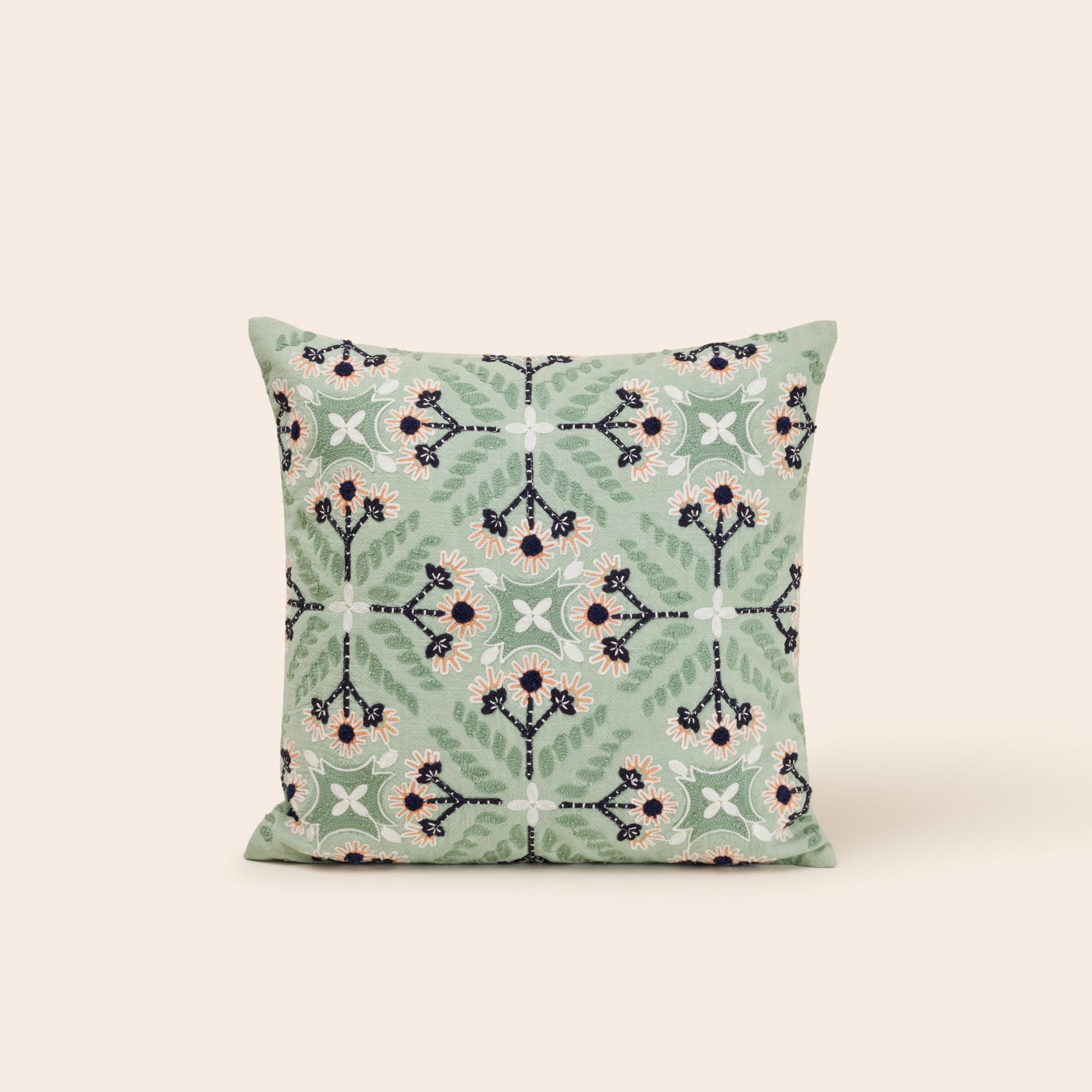 La broderie artisanale en fil de coton illustre un savoir-faire minutieux, chaque point reflétant la main de l'artisan. L'équilibre parfait entre motifs graphiques et éléments floraux crée une dynamique visuelle captivante, rendant chaque coussin à la fois audacieux et élégant.