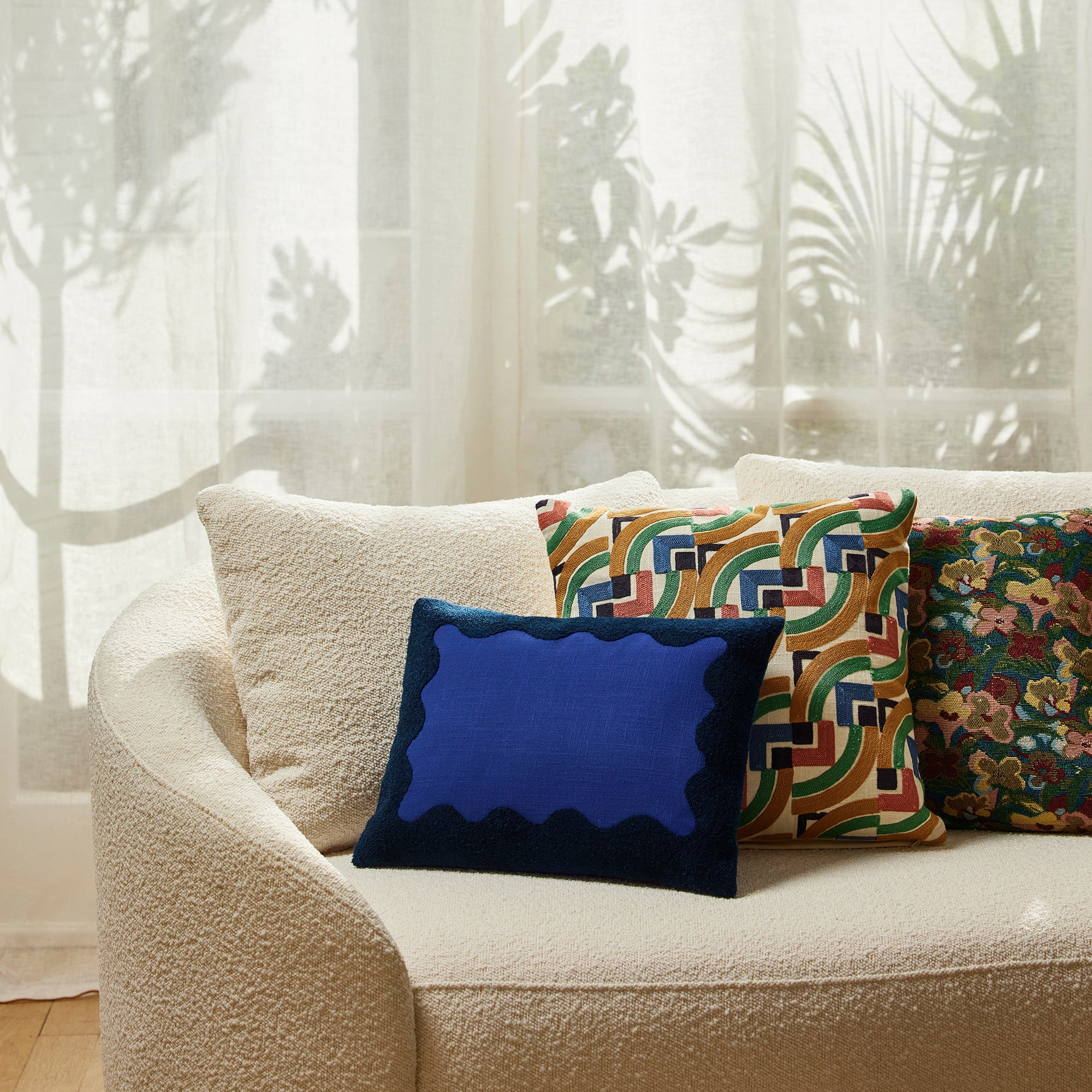 Le design central du coussin, un cadre ondulé brodé en point de bouclette, évoque les vagues de l'océan, offrant une expérience tactile grâce à son aspect moelleux en relief.