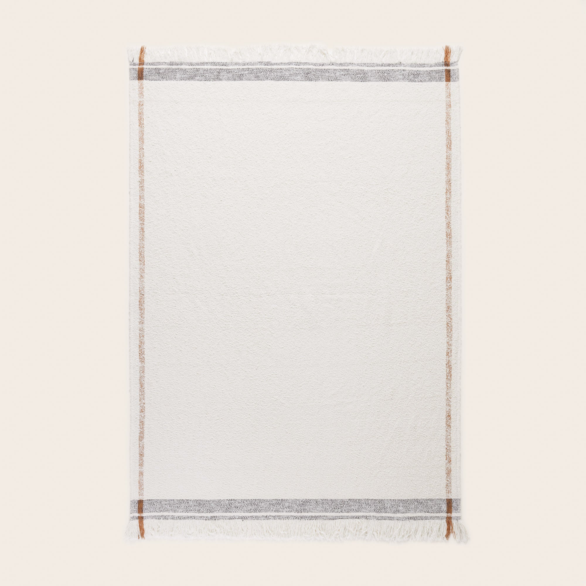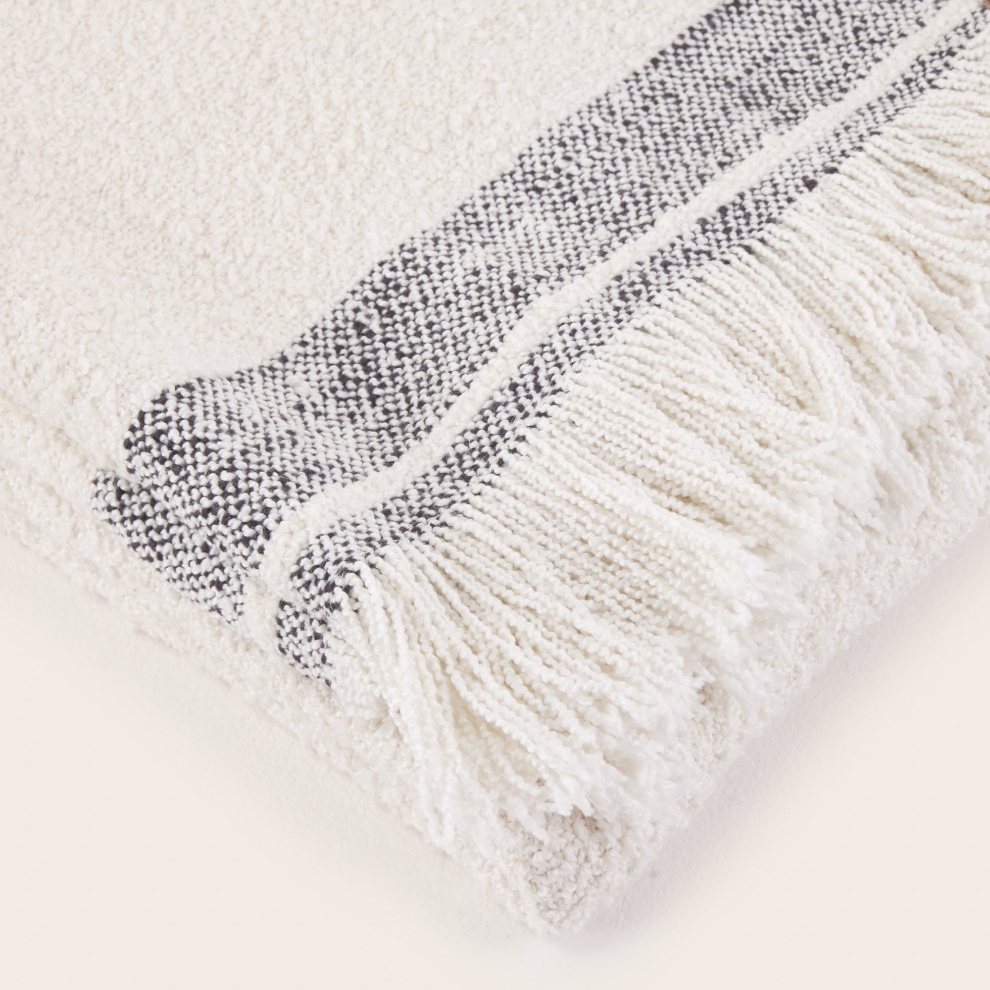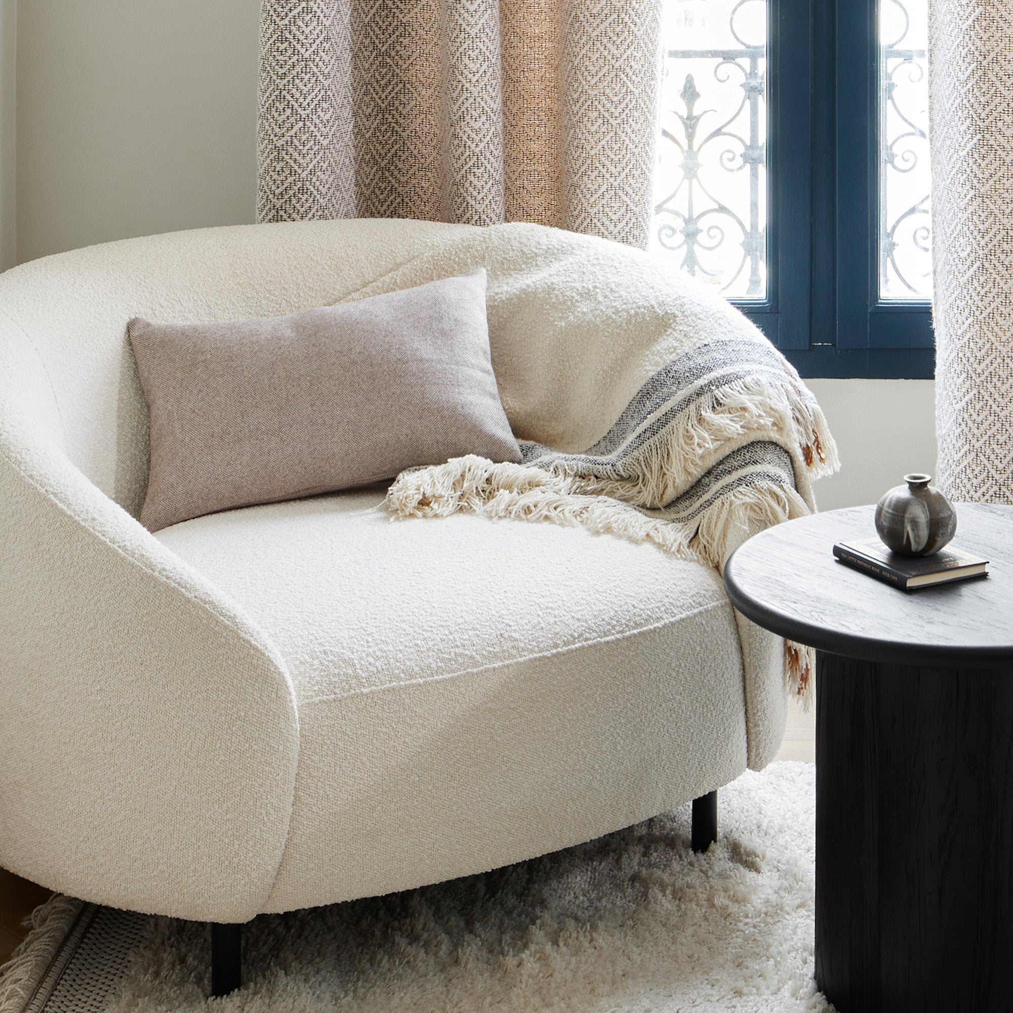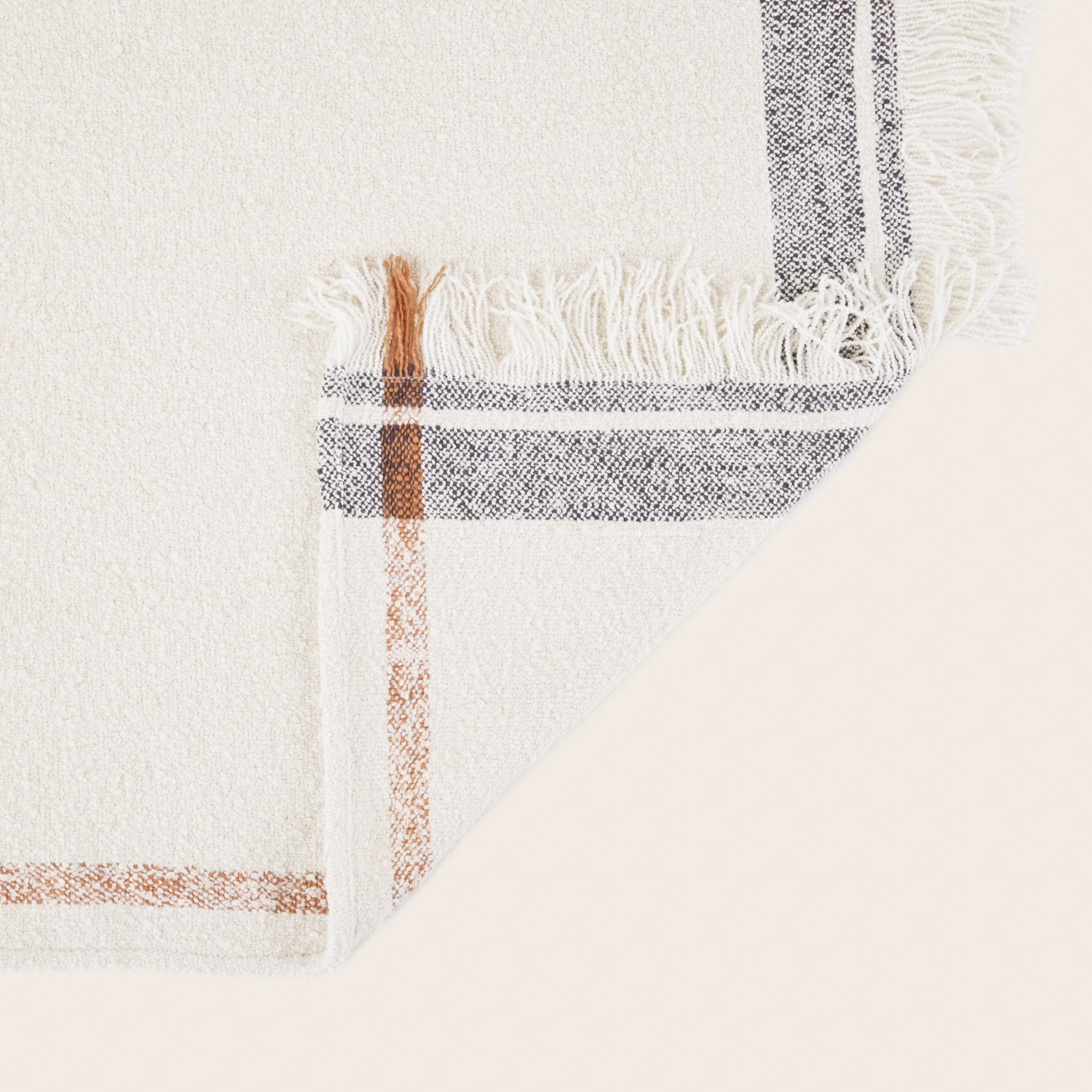Doté d’une texture bouclée dense, douce et moelleuse au toucher et d’un bordé au tissage carreau XXL à l’effet chiné. Sa finition avec de longues franges accentue son style enveloppant et cosy. Pour une décoration sans fausses notes vous pouvez le combiner à nos coussins, rideaux et assises en bouclette écrue. Pour obtenir un contraste plus fort vous pourrez lui associer du brun caramel ou du gris anthracite.