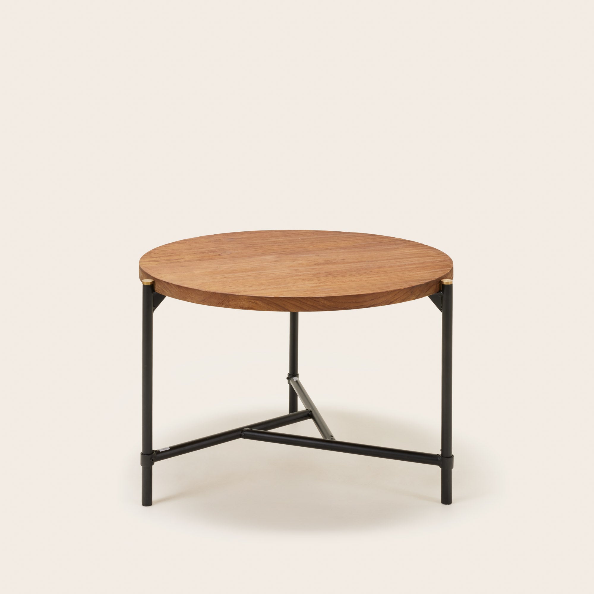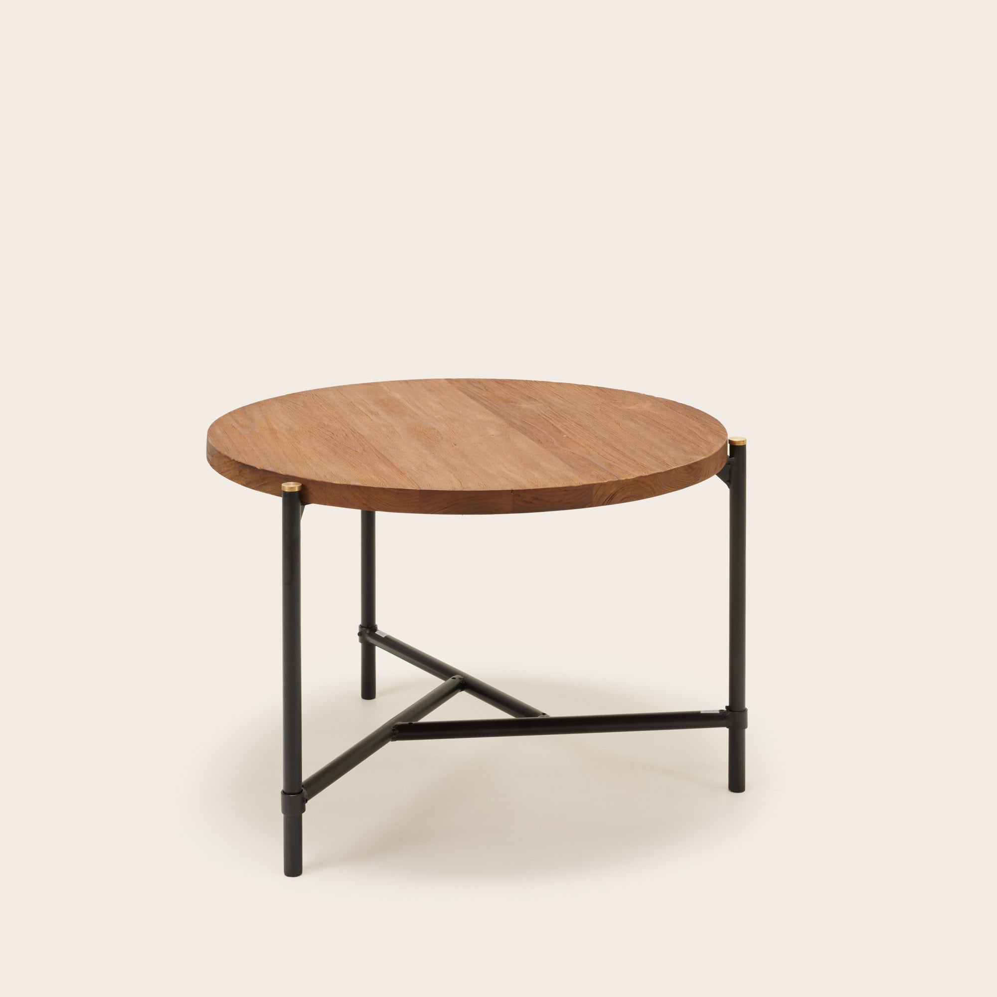 Le mariage des matériaux lui donne de la sophistication et une belle harmonie : un plateau rond en teck recyclé - qui donne une seconde vie à d’anciens bois de constructions javanaises -, le métal sur le piètement fin et les pastilles de laiton en finition ultra raffinée. Sa taille compacte de diamètre 60 cm trouvera facilement sa place dans un petit espace mais sera aussi du plus bel effet dans un salon plus spacieux si on la joue en association avec le modèle de diamètre de 40 cm.