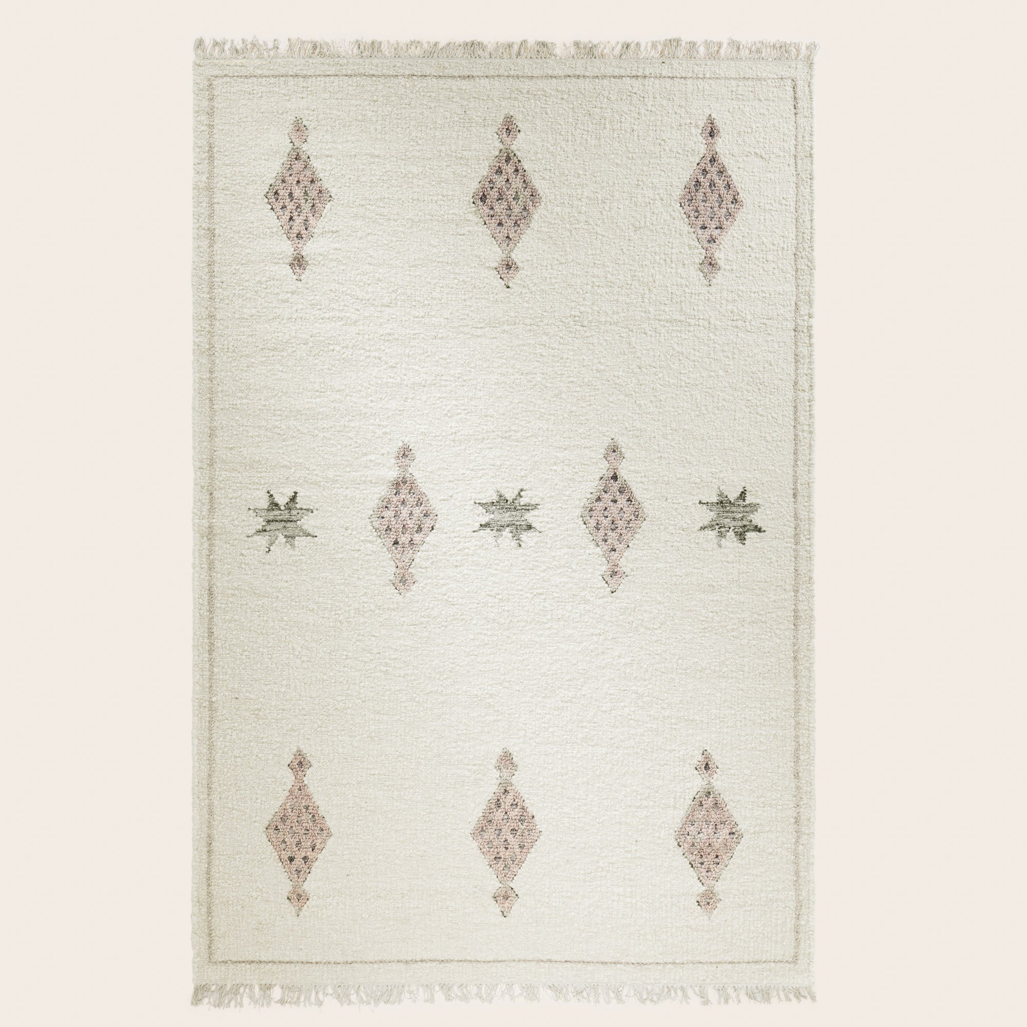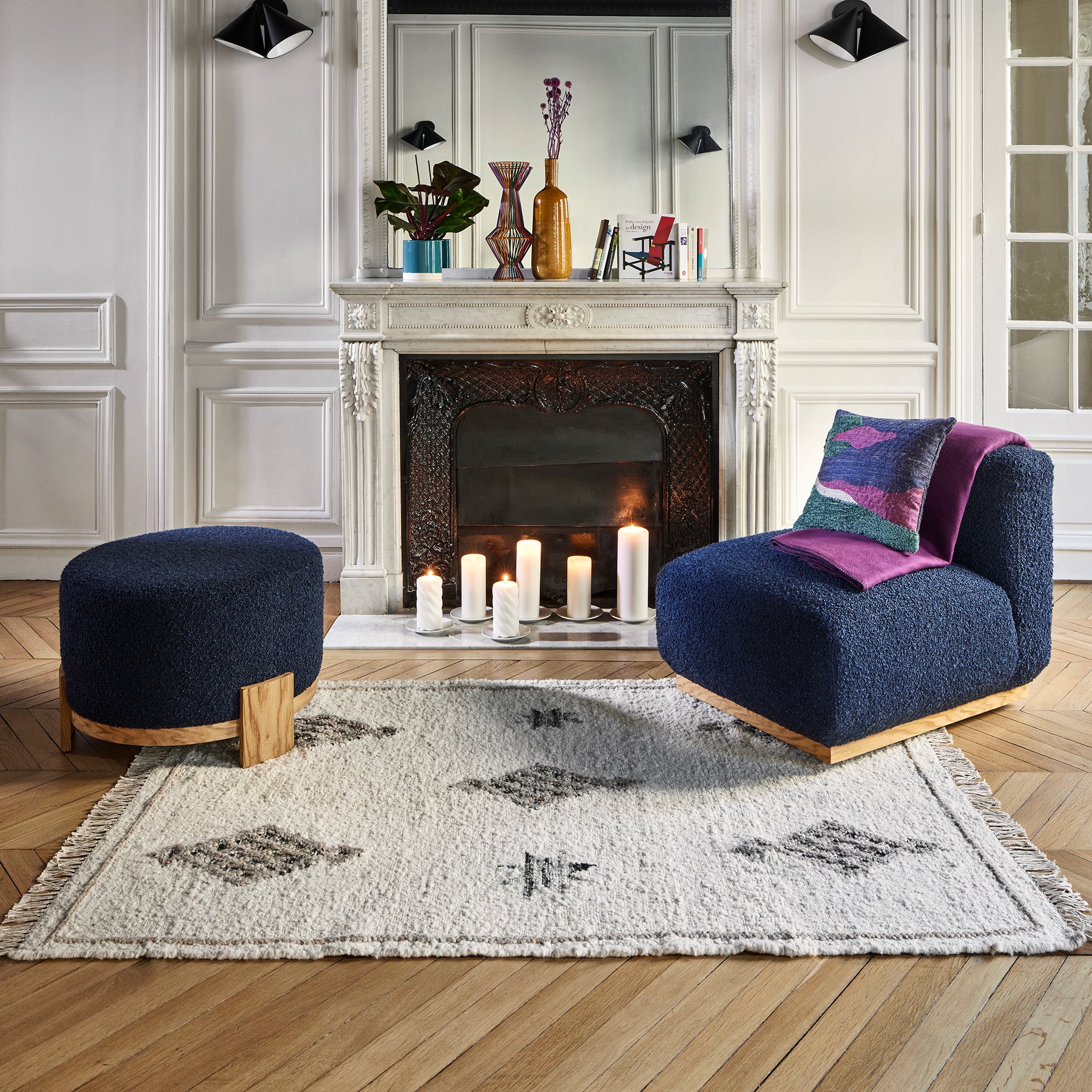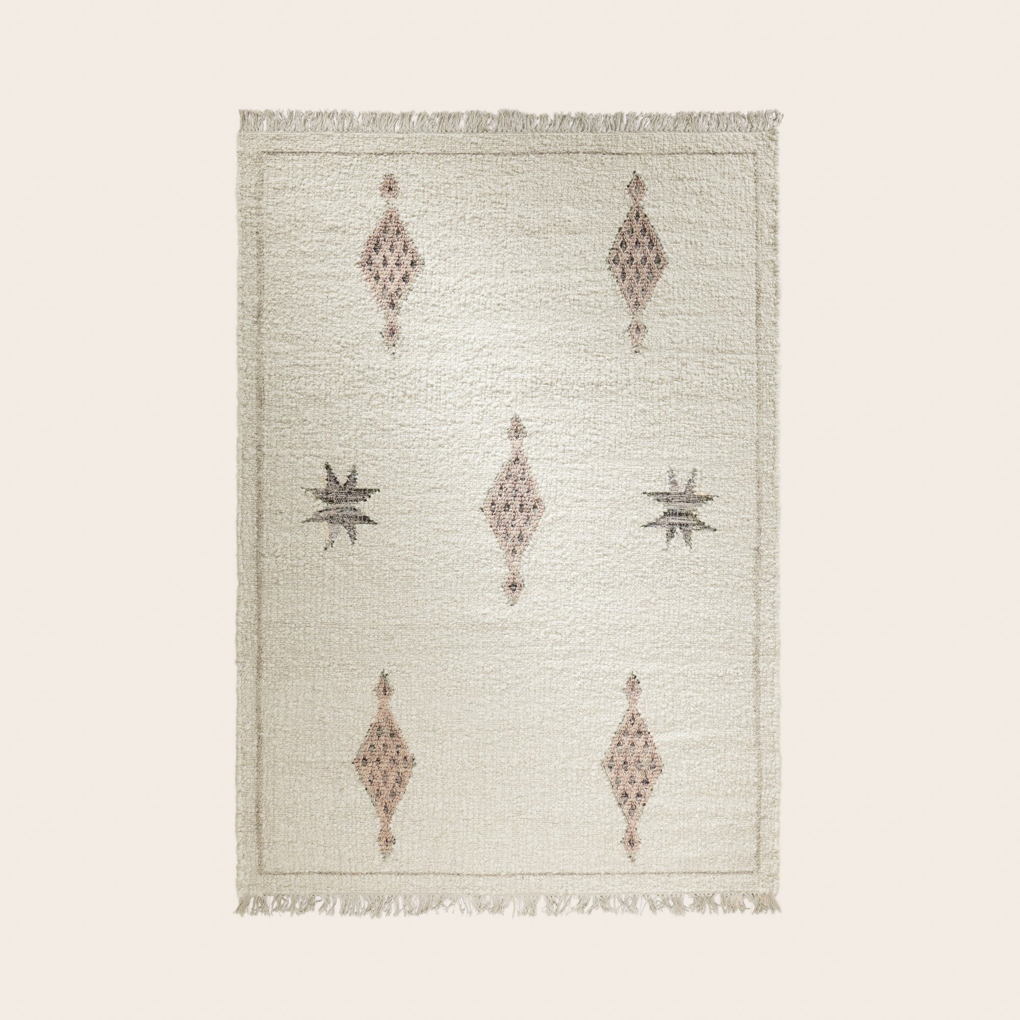 Composé à 80% de laine, le tapis Fadi est le produit parfait pour garder vos sols au chaud durant toute la saison. Son motif composé de losanges et d’étoiles lui donne un aspect folk ethnique. Ses coloris ivoire et gris s’associeront avec douceur dans vos salons.
