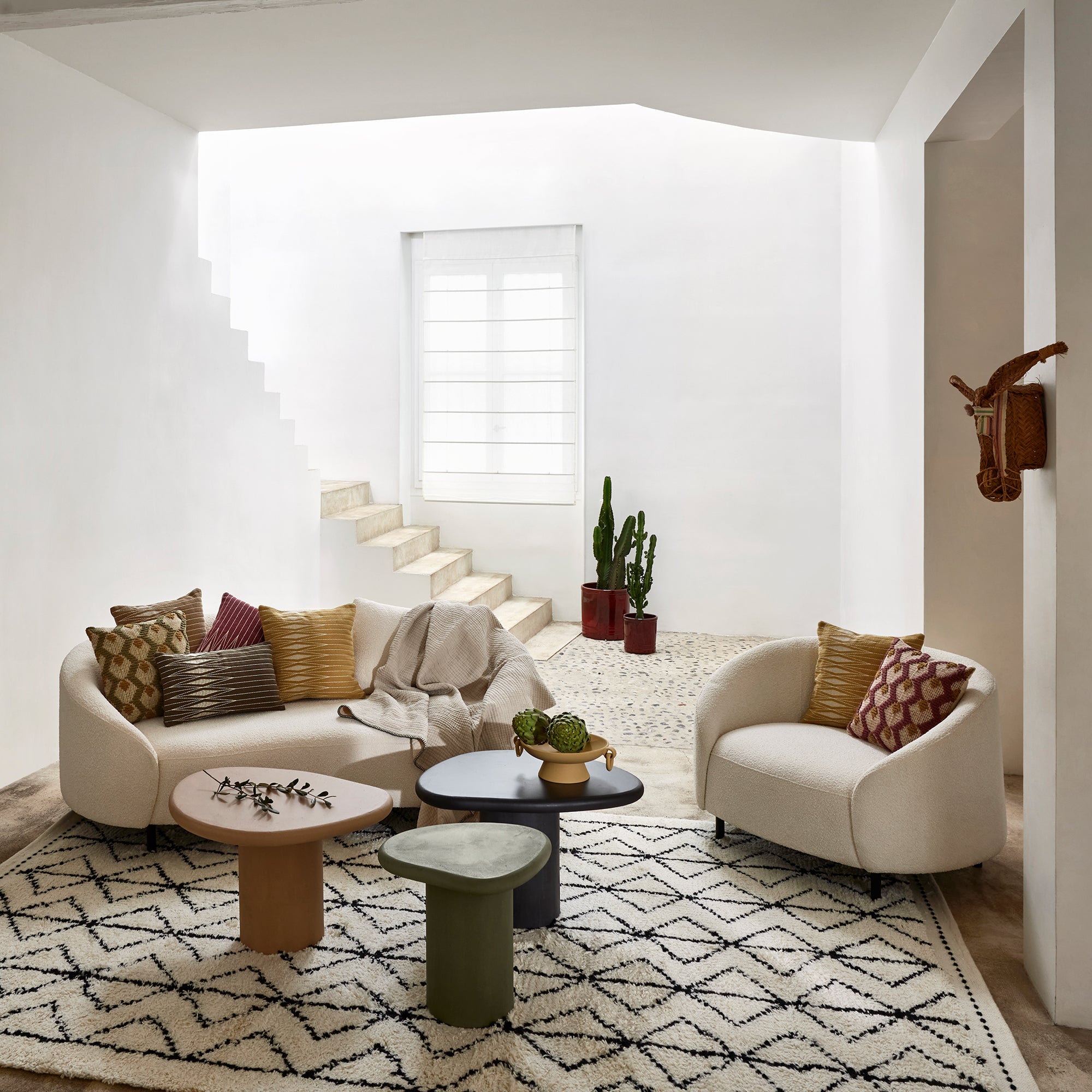 Le tapis Ydir vous transportera immédiatement vers de lointaines contrées. Inspiré des motifs ethniques et graphiques berbères, il est fabriqué artisanalement dans une laine ivoire et noir d’une grande douceur.
